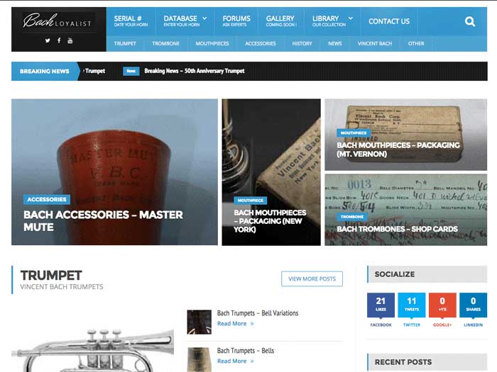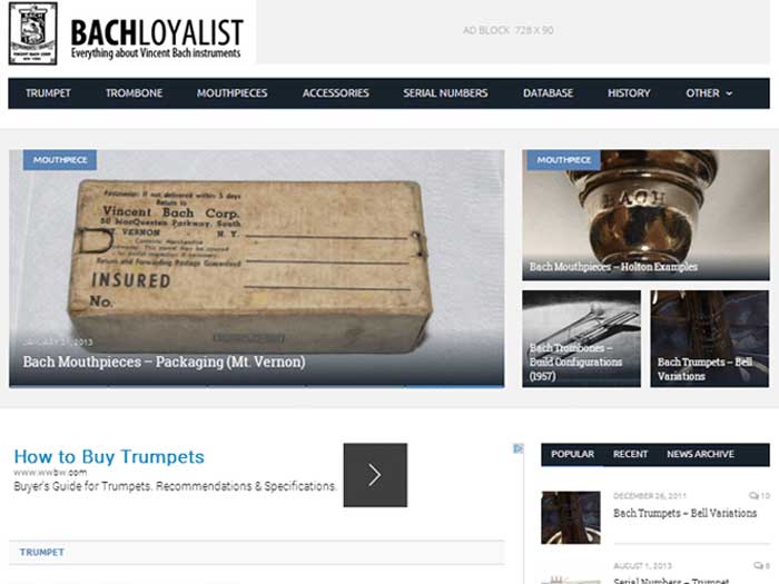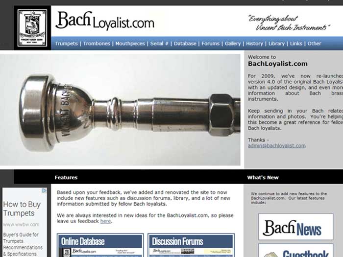 We updated the design and added a lot of content in 2009 to BachLoyalist. The site was still hand-coded using HTML, and specific details on Bach Trumpets, Trombones, Mouthpieces, and updated Serial Number lists were added.