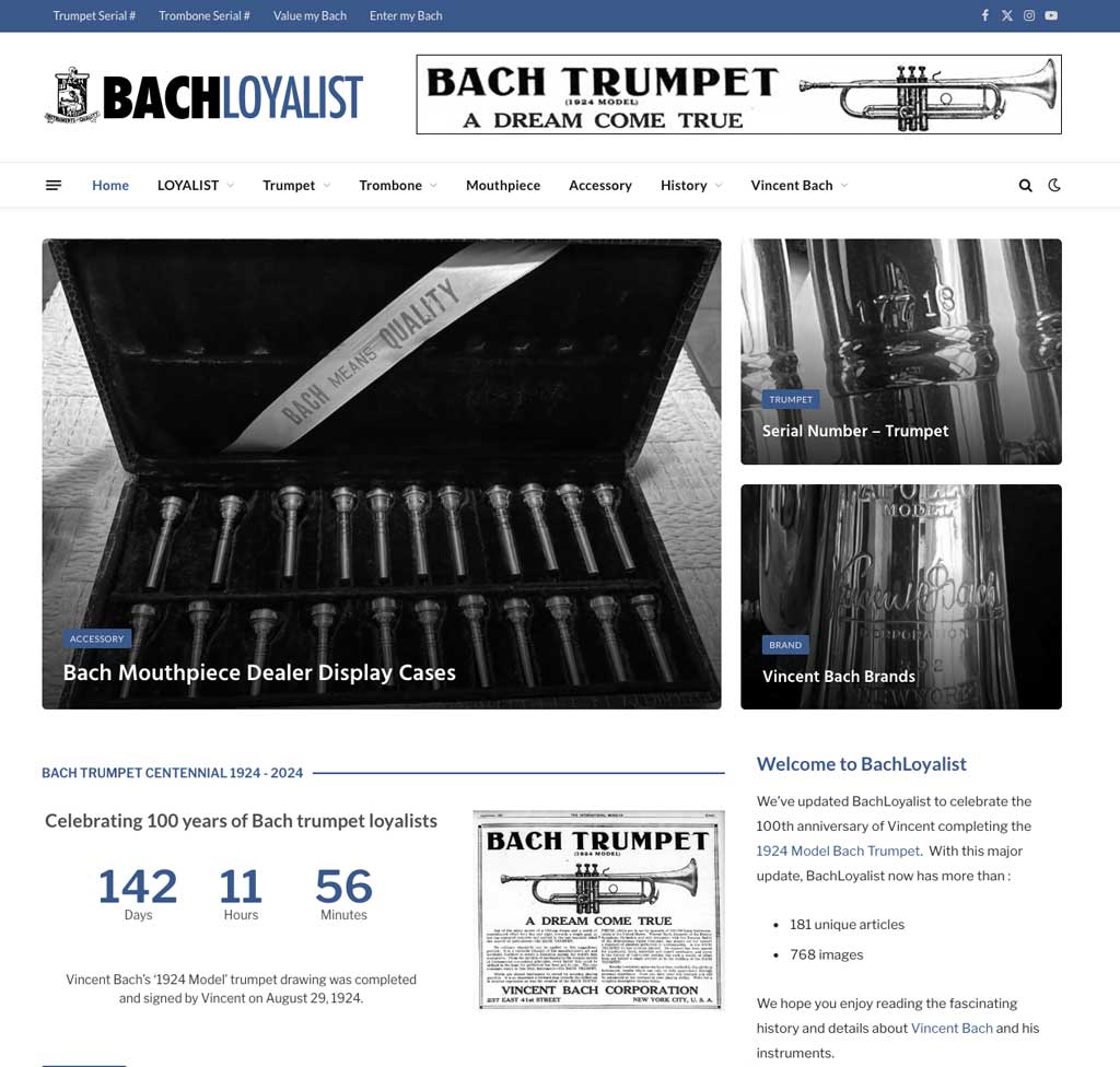 In early 2023, we updated BachLoyalist to a more modern & easy-to-read customer experience. We are still updating the site, including a newsletter, updating the Bach instrument database, building a library of Vincent Bach Corporation, Inc. catalogs, etc. Additionally, we added: