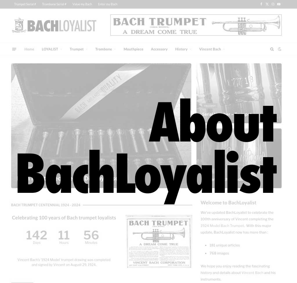 The BachLoyalist.com website was started in 2000 with the goal of building a complete reference to everything related to Vincent Bach and the various Bach-branded trumpets and trombone instruments. This site has grown through the many contributions of fellow Bach loyalists and is the most complete reference of Bach-related instruments on the Internet.
