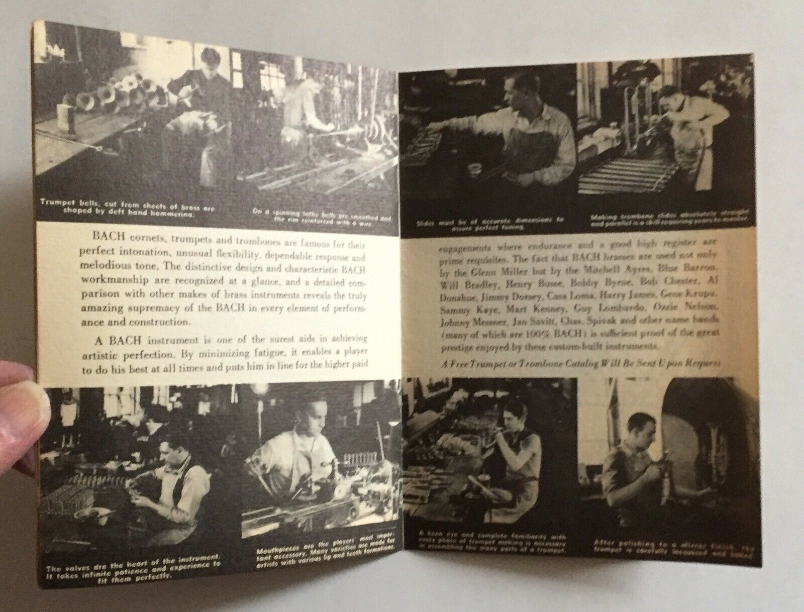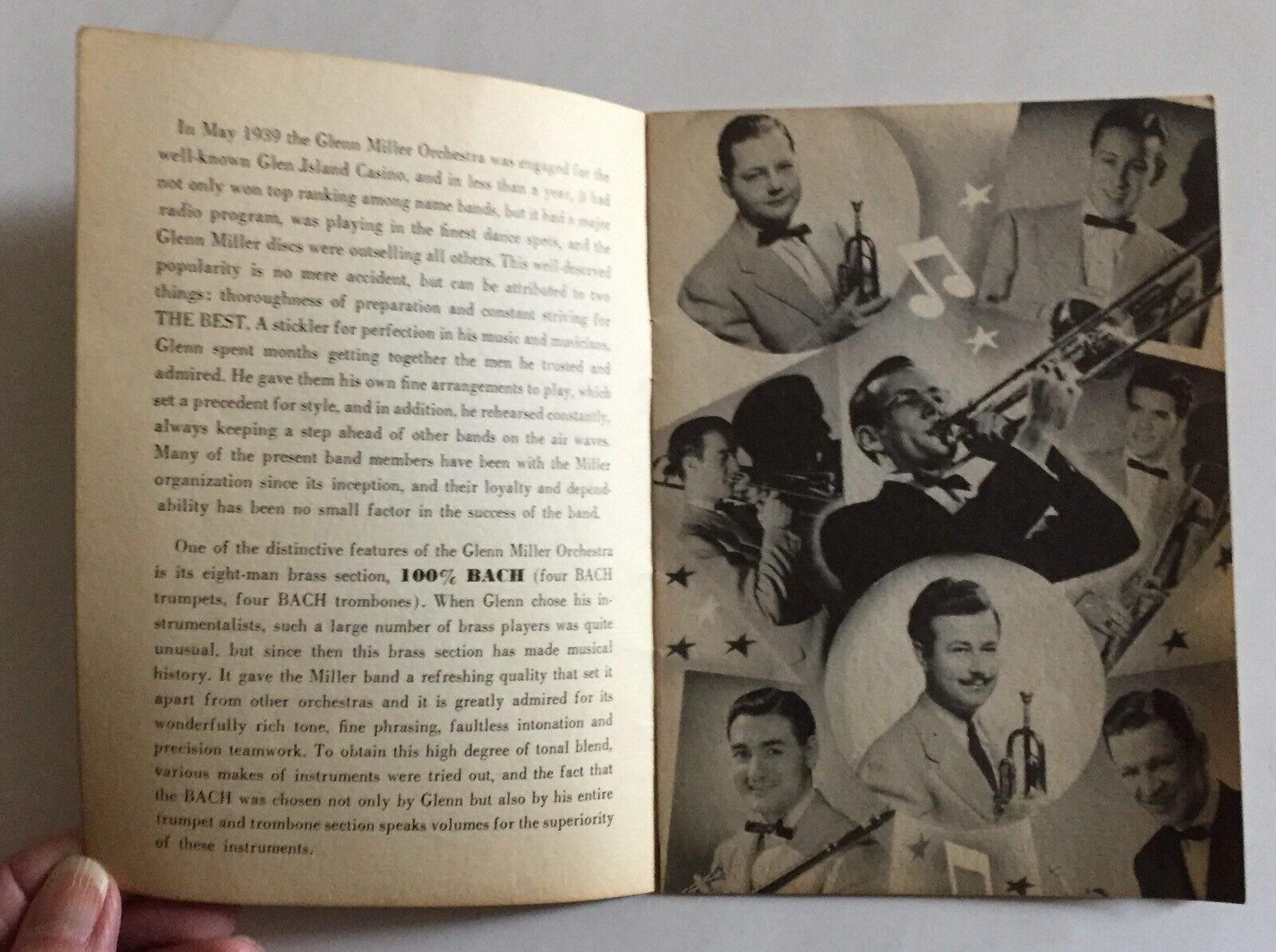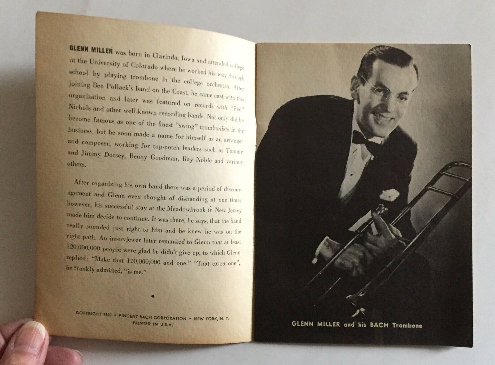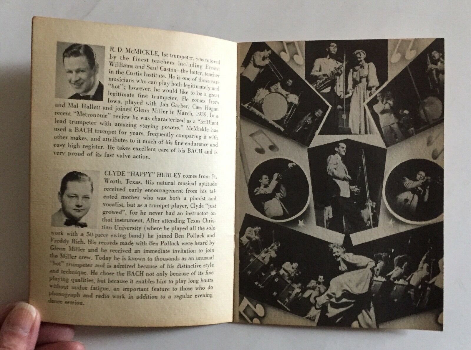 A favorite Vincent Bach Corporation promotional brochure includes the 1940 Glen Miller and his Orchestra booklet. Below are photos of the pages from this brochure.