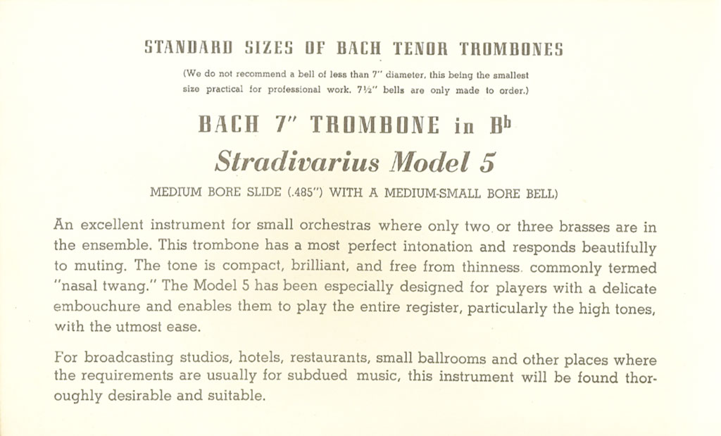 ” Designed primarily for solo playing, with fast technical passages. When trying this instrument you will not find words to express your delight and amazement. Slightly lighter-built slides enable a very fast slide vibrato and astonishing flexibility. Remarkable intonation and response, with or without mute; compact brilliant tone, free of nasal twang. An ideal instrument for smaller orchestras, radio and recording studios, restaurants, and other places requiring subdued music. In designing this instrument, we were guided principally by our desire to help players with delicate embouchures. to enable them to perform the entire register, particularly the high tone with the utmost ease. Therefore, for reliable response, sufficient resistance, and consequently great endurance, this STRADIVARIUS MODEL 4 is the instrument for you. “