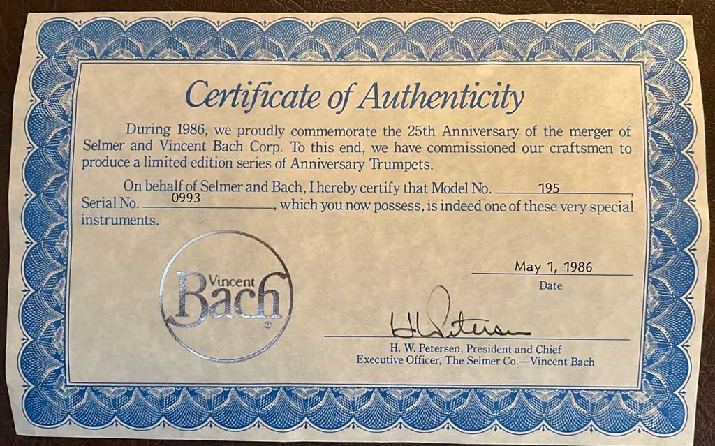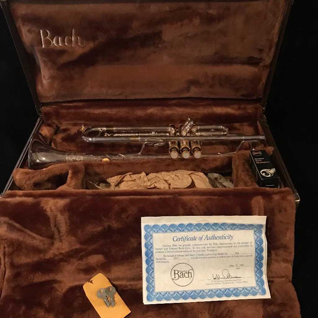 ” Bach Stradivarius 25th Anniversary trumpet model 194. Celebrates the 25th Anniversary between the Bach Corporation and the Selmer Corporation in 1986. The trumpet is a reverse leadpipe, rounded tuning slide, commemorative medallion, two water keys, custom anniversary engraving.”
