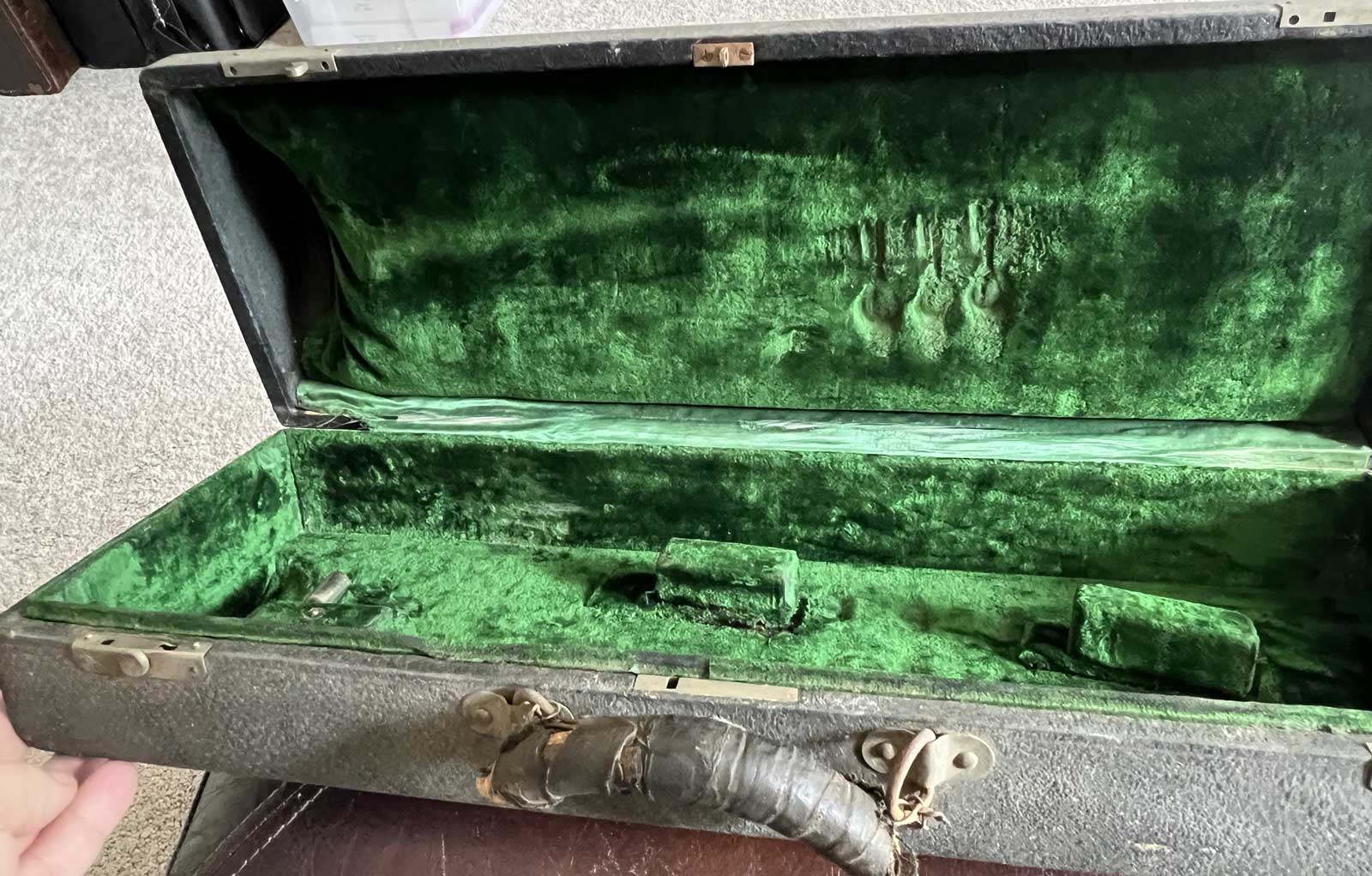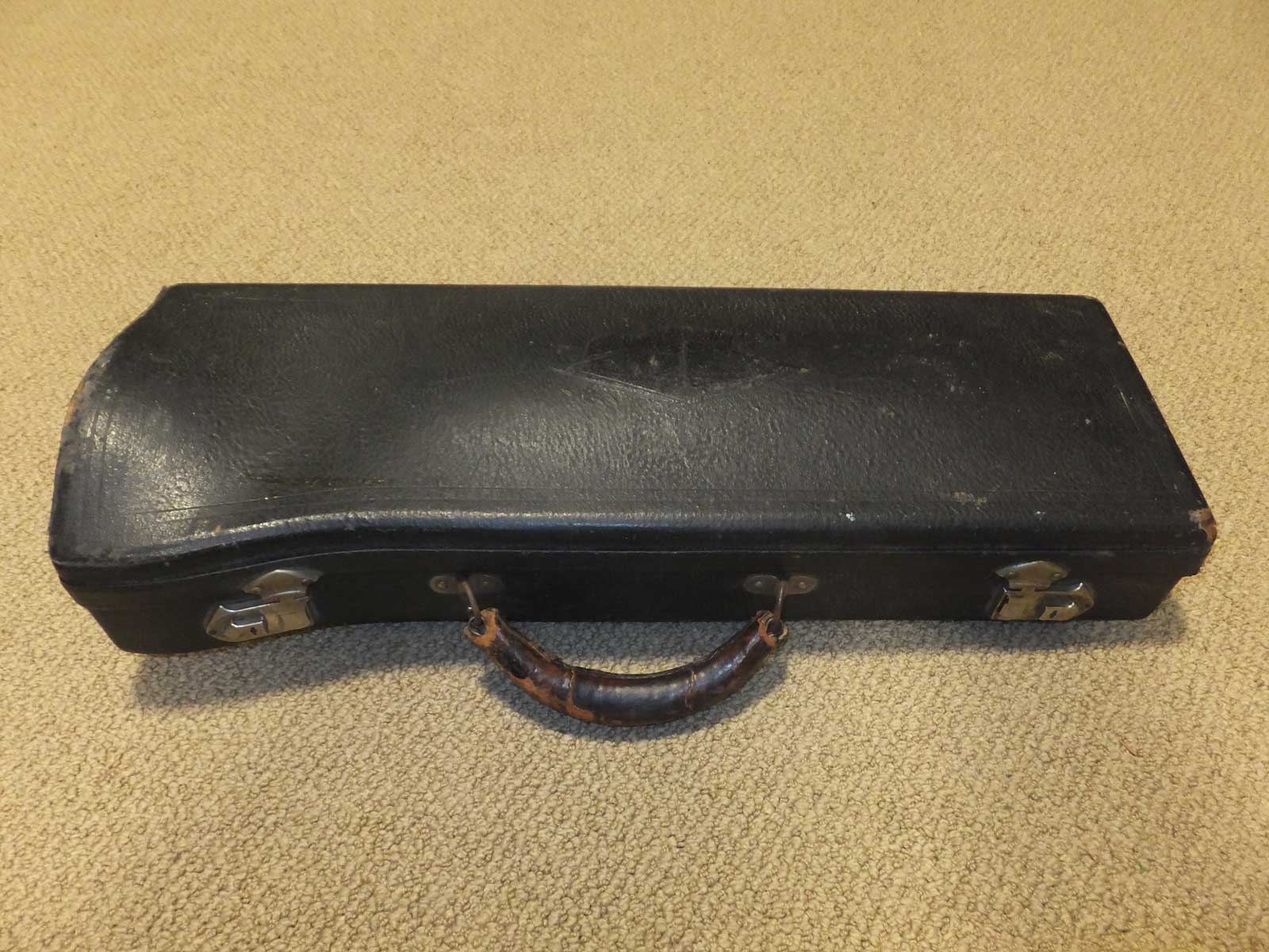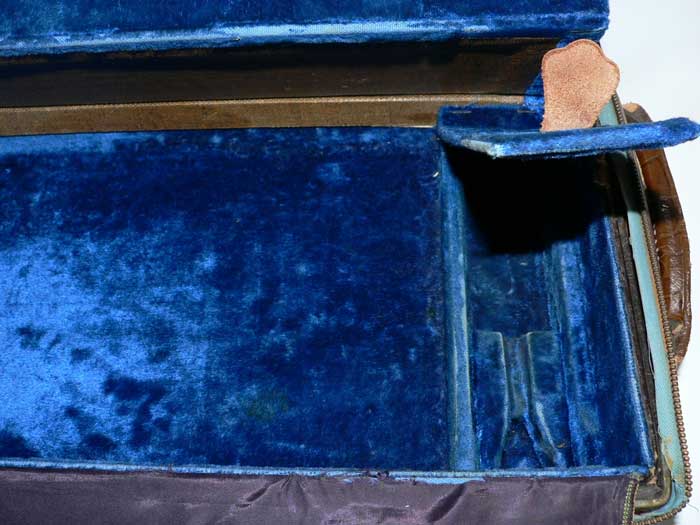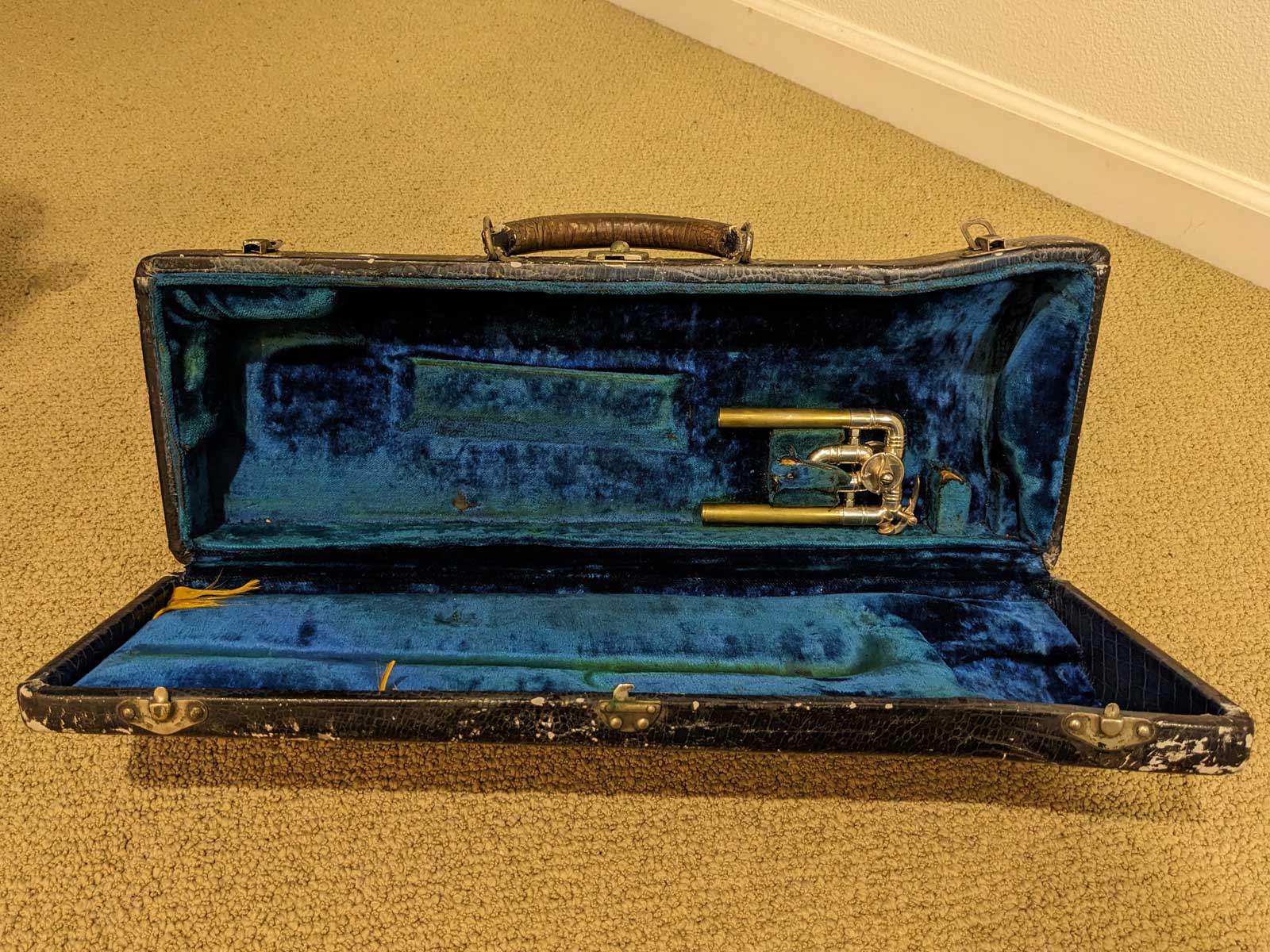 Curiously, this case did not have the Bach Emblem on the outside of the case. No nail holes are present, so it would not have been applied. This was also when Vincent Bach Corporation was transitioning away from the Bach SunShine logo.