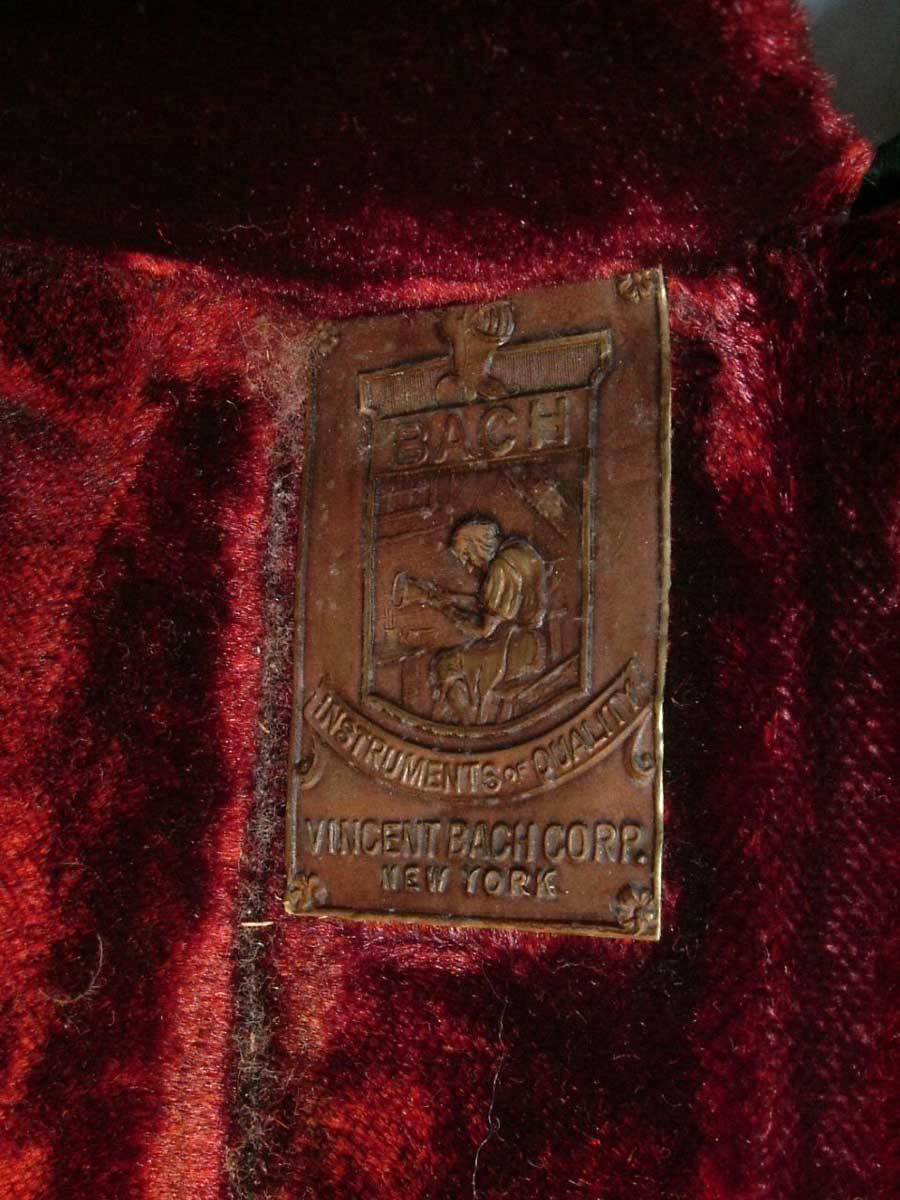 The “Vincent Bach” Corporation ribbon was also in a Times-style font, unlike other Vincent Bach script-style font silk banners used later in 1925 – 1926. The case has a royal blue interior, unlike other later Bach case examples.