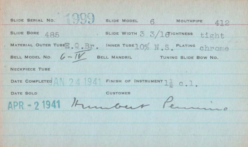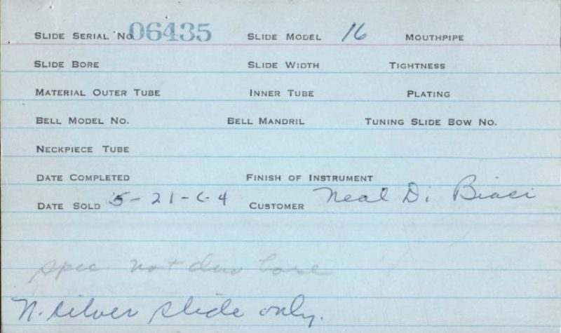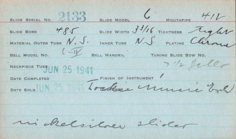 | Stradivarius | 1999 | 6iv | 6IV | 412 | 0.485″ | Lacquer | 1941 | 🎺 | Sold: 1/2/1941 | TromboneForum | |
