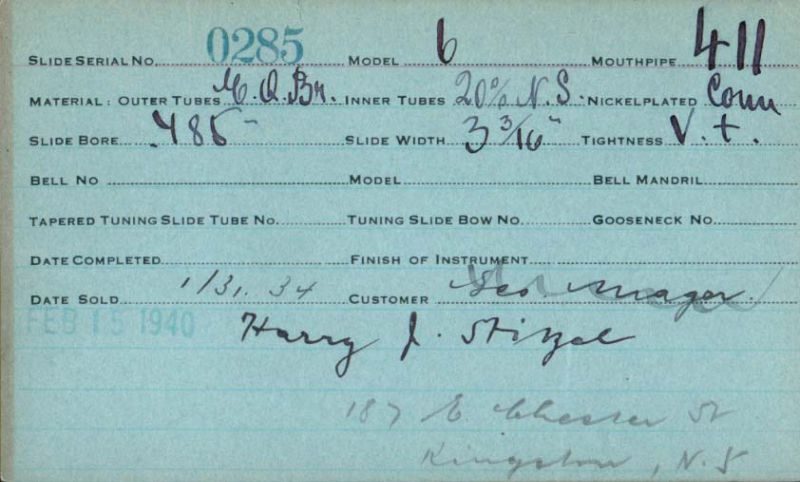 | Stradivarius | 285 | 6 | 6 | 411 | 0.485″ | 1934 | 🎺 | Sold: 2/15/40 | TromboneForum | ||