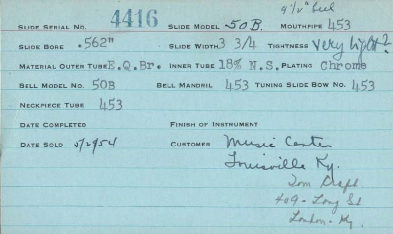 | Stradivarius | 4416 | 50B | 453 | 453 | 0.562″ | 1954 | 🎺 | TromboneForum | |||