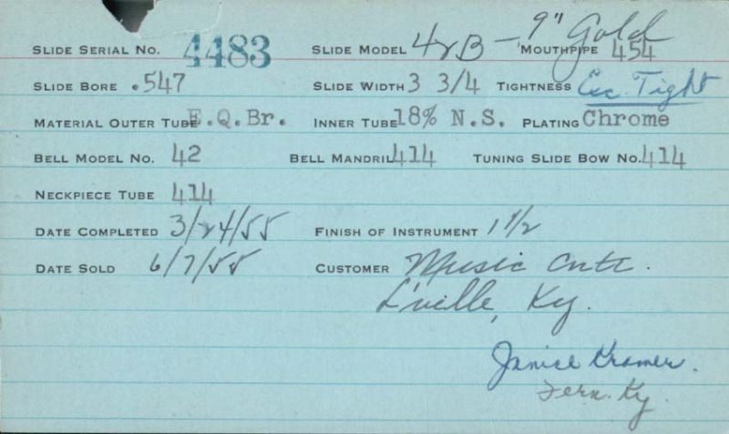 | Stradivarius | 4483 | 42B | 414 | 454 | 0.547 | 1955 | 🎺 | 9″ Gold Bell, Sold 6/7/55 | TromboneForum | ||