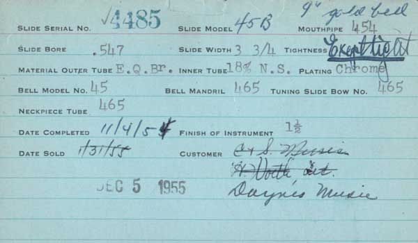 | Stradivarius | 4485 | 45B | 465 | 454 | 0.547 | Lacquer | 1955 | 🎺 | TromboneForum | ||