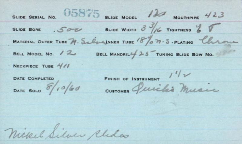 | Stradivarius | 5875 | 12 | 425 | 423 | 0.500″ | Lacquer | 1960 | 🎺 | Nickel Silver slides | TromboneForum | |