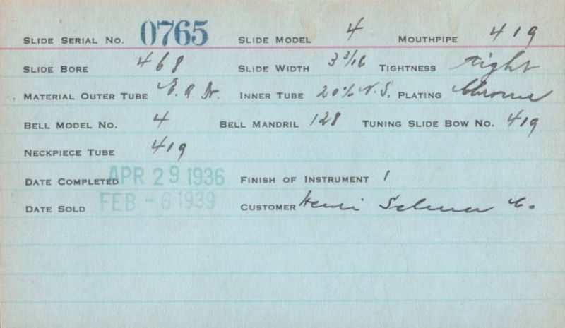 | Stradivarius | 765 | 4 | 128 | 419 | 0.468″ | Lacquer | 1936 | 🎺 | Sold 2/6/1939 | TromboneForum | |