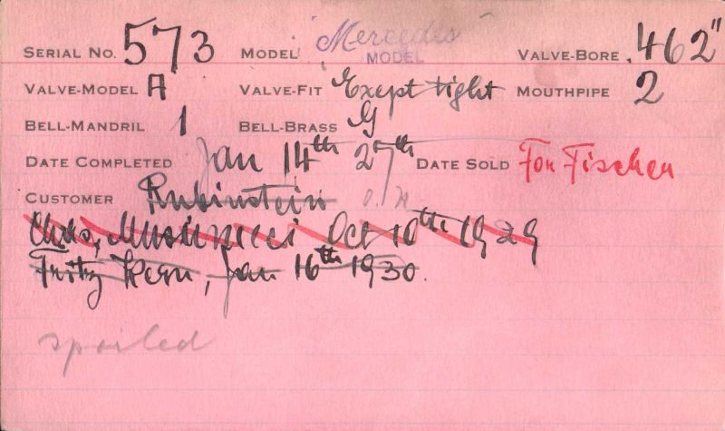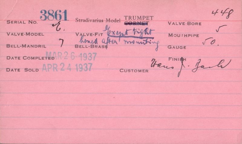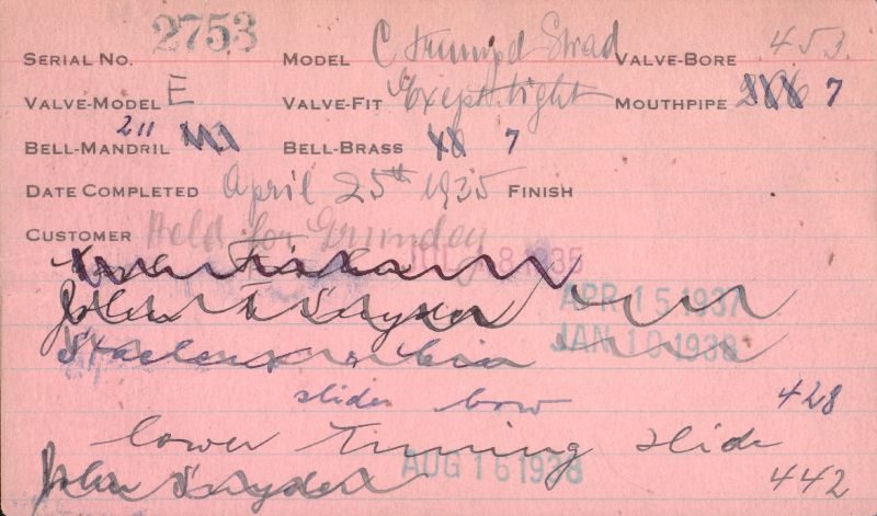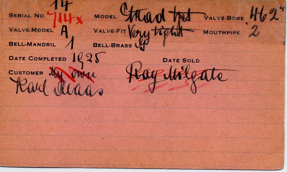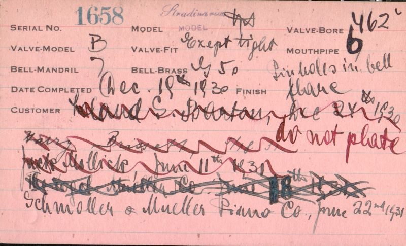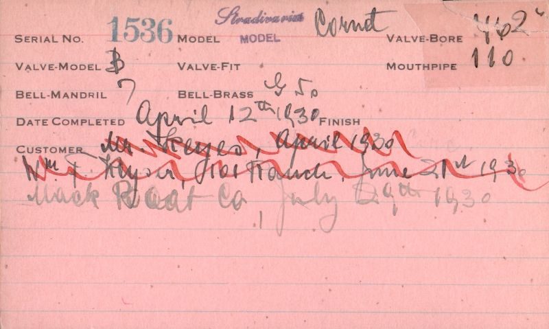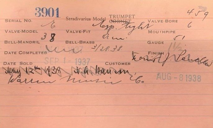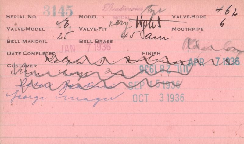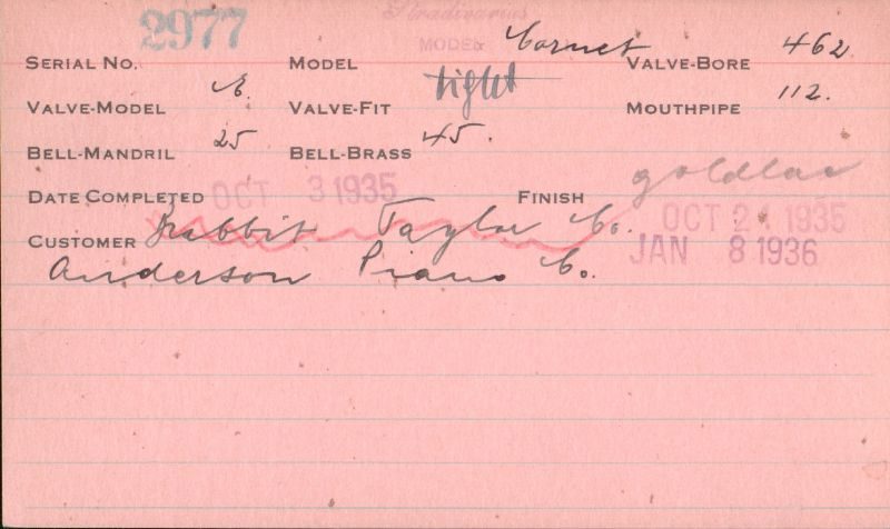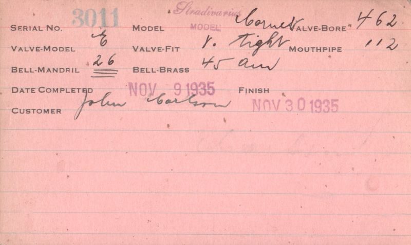 | Stradivarius | 3343 | Cornet | 25 | 112 | 0.462″ | Lacquer | 1936 | Built/Sold 4/27/36 Ivan C. Kay per Shop Card Repaired by G.M. “45” (.018″) | Desautels, J. | 95404 | |