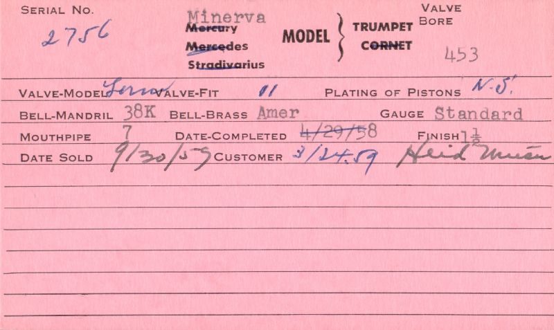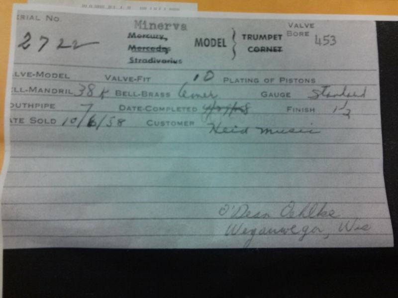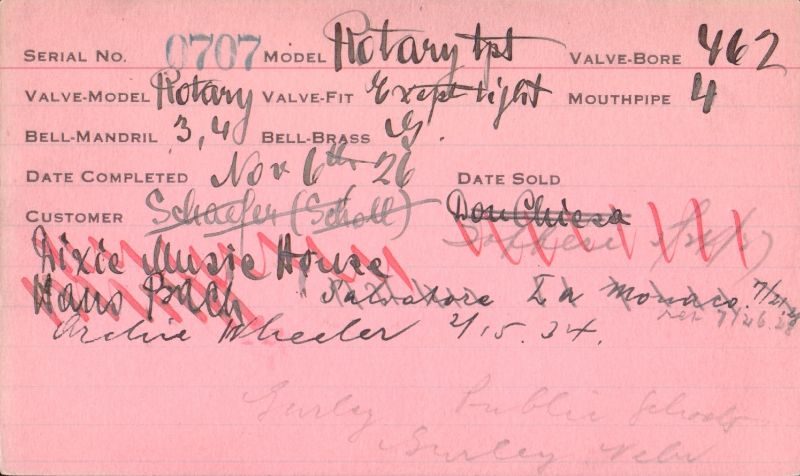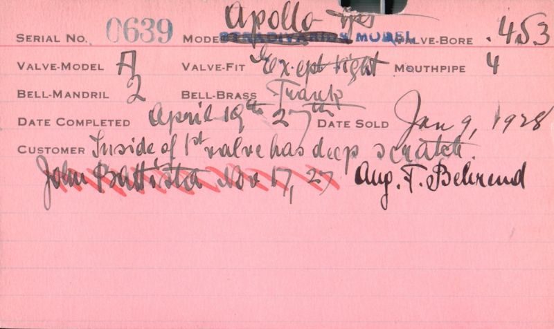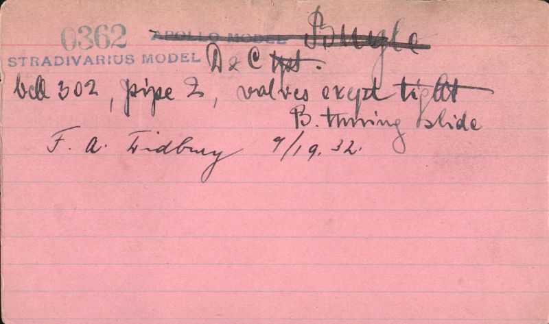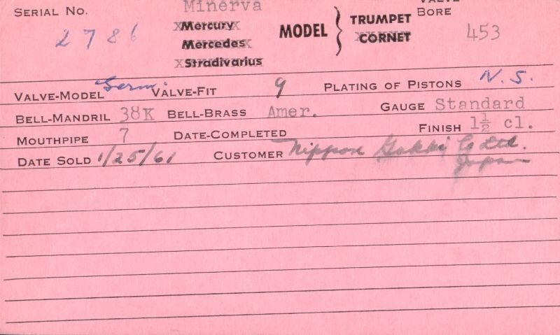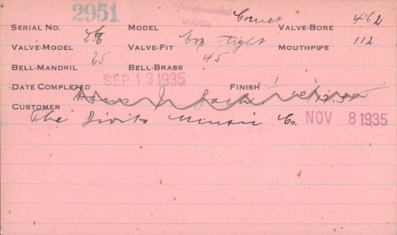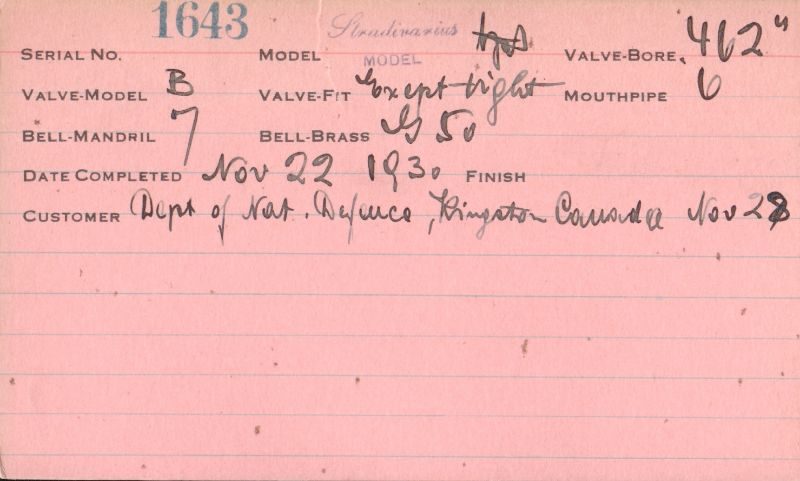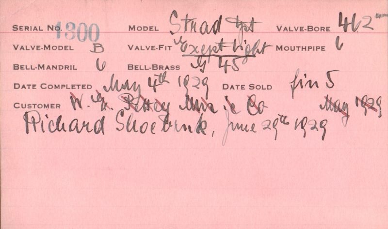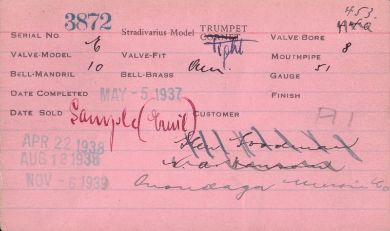 | Stradivarius | 3343 | Cornet | 25 | 112 | 0.462″ | Lacquer | 1936 | Built/Sold 4/27/36 Ivan C. Kay per Shop Card Repaired by G.M. “45” (.018″) | Desautels, J. | 95404 | |