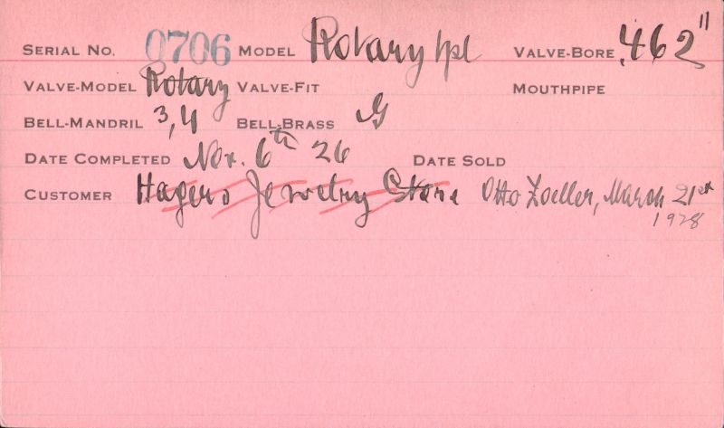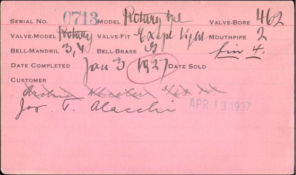 | Stradivarius | 713 | Rotary, Bb | 3,4 | 2 | L | Gold | 1927 | 🎺 | Sold: 4/13/1937 | Bach Brass | |