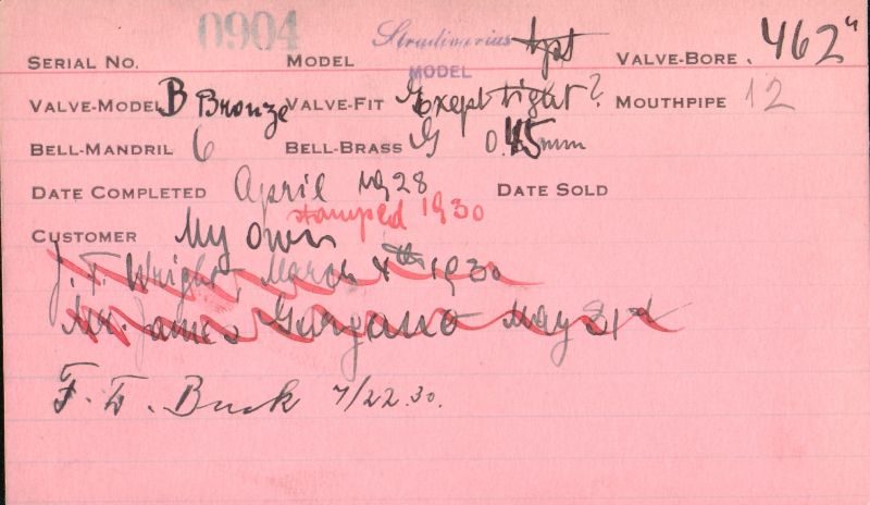 | Stradivarius | 2071 | 7/10/1962 | 41100 | 0.462 | Circa 1932-35 Stradivarius w/ a combination 7, 10 Bell Mandrels | Christy | 62999 | ||||