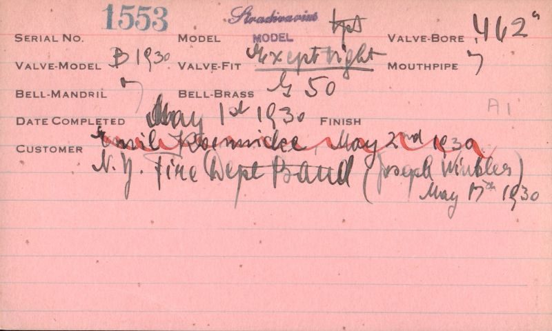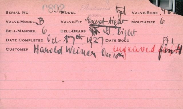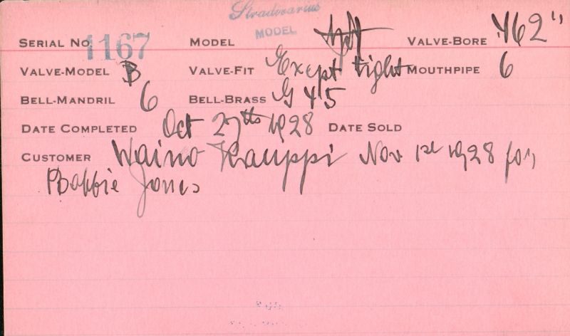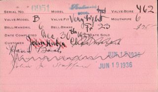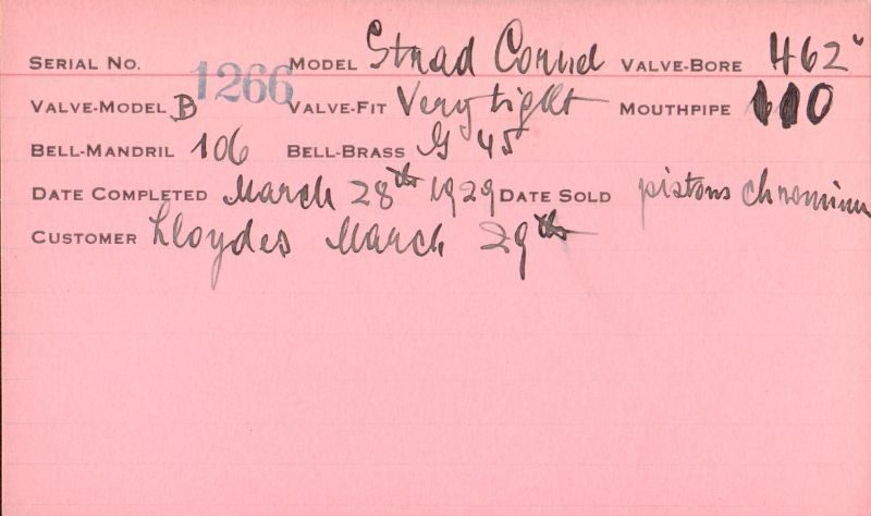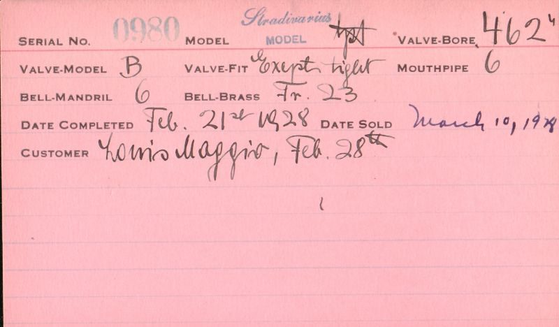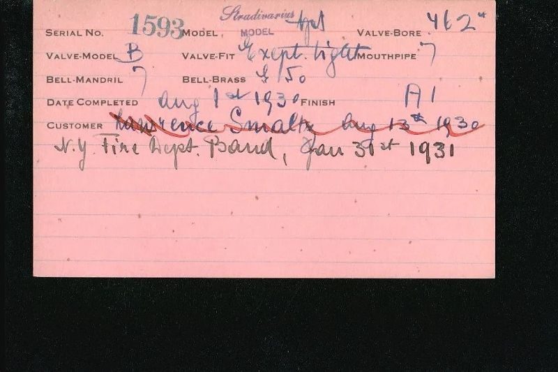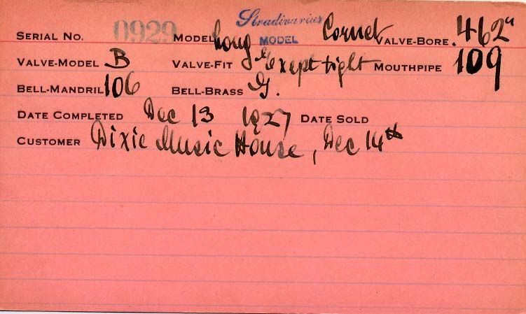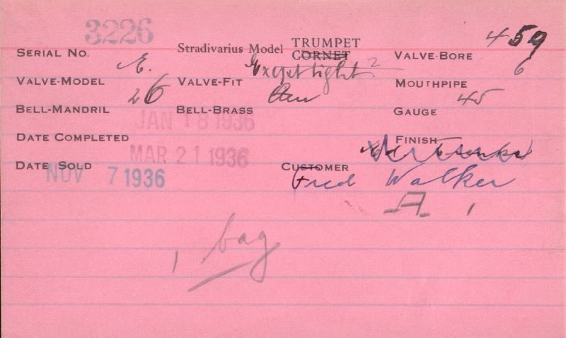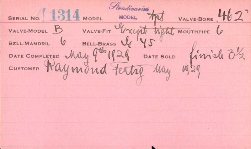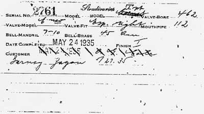 | Stradivarius | 186 | 219 | Originally had a #4 bell, replaced in factory to a 219 in 1927 | Landress | 10036 | ||||||