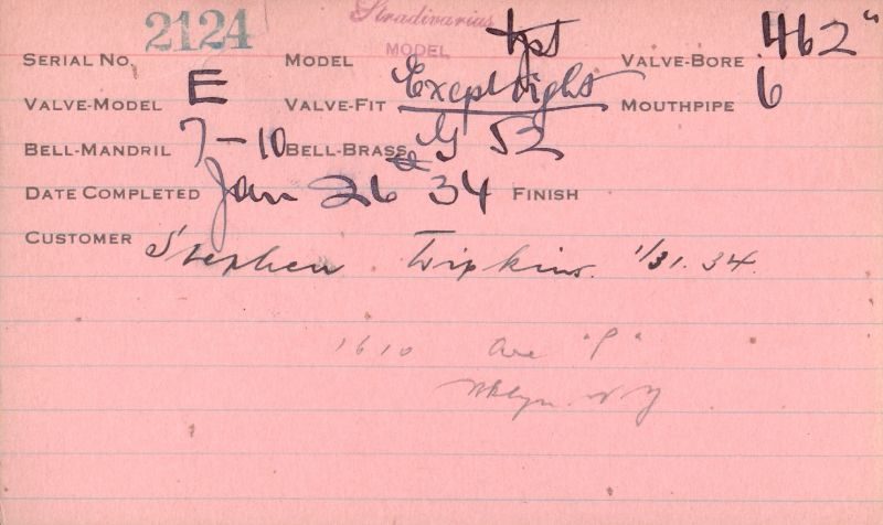 | Stradivarius | 2124 | 7-10 | 6 | L | Lacquer | 1934 | 🎺 | 1/26/34, Sold 1/31/34, BellBrass G52 | |||