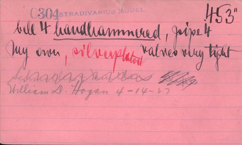 | Strad_Anniversary | 0267 | 195 | 43 | 25LR | Silver | 1986 | Gold inside bell, valve caps | Kaufman | 92648 | ||