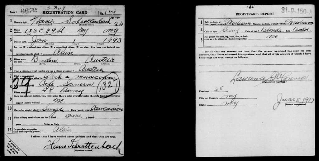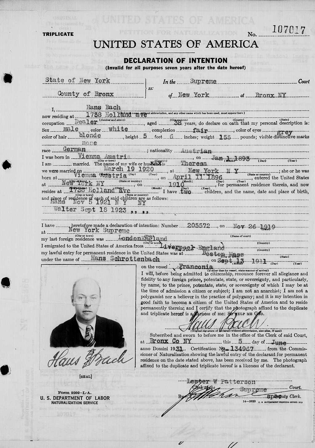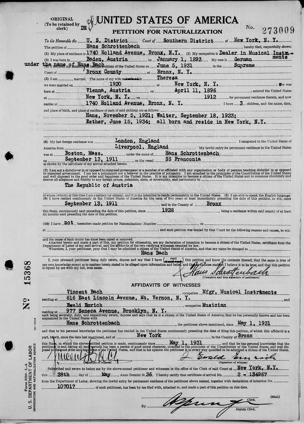 Hans Schrottenbach immigrated to the United States in 1911, arriving in Boston on the SS Franconia. Below are the Declaration of Intention (1931) form, and Petition for Naturalization (1936) form. His brother Vincent was a witness and also signed his name. He was living in Mt. Vernon at this time.