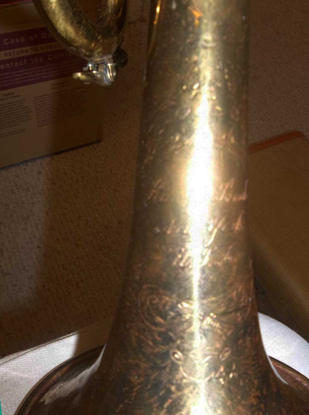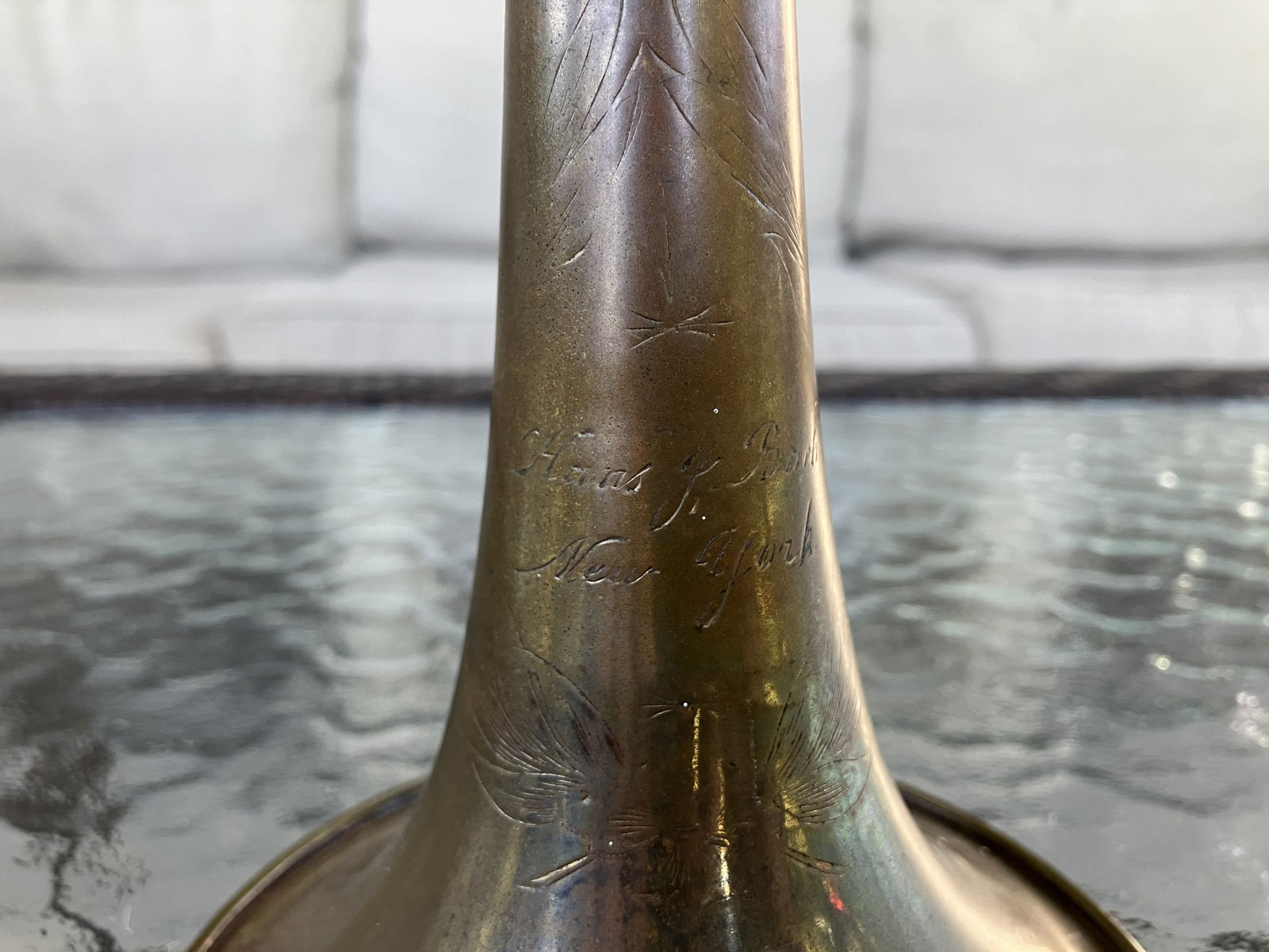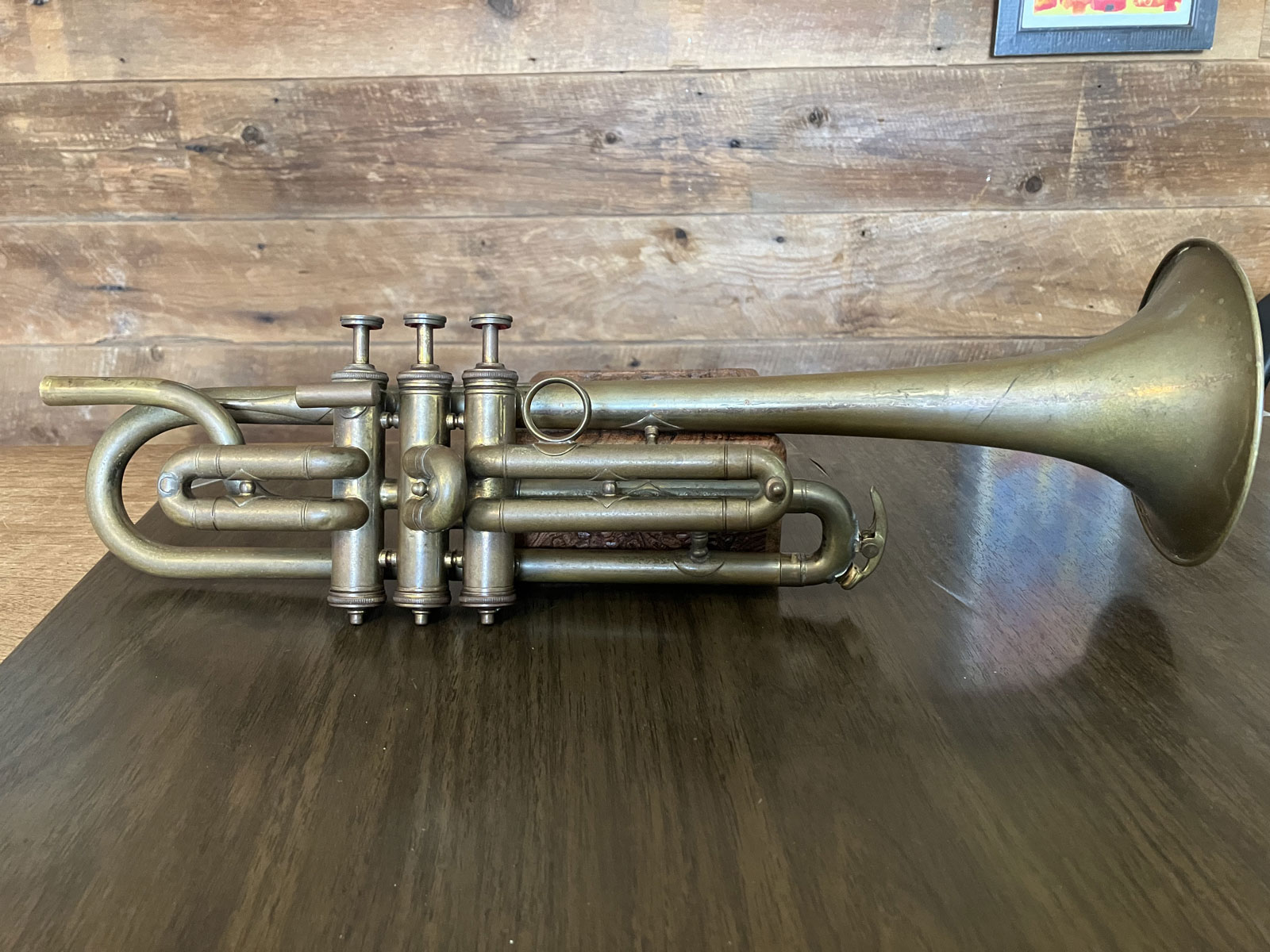 This Hans Bach trumpet was most likely an imported/stenciled European trumpet model, which Hans Bach carried in his music store in the 1930s. This instrument is unique in style and shape.