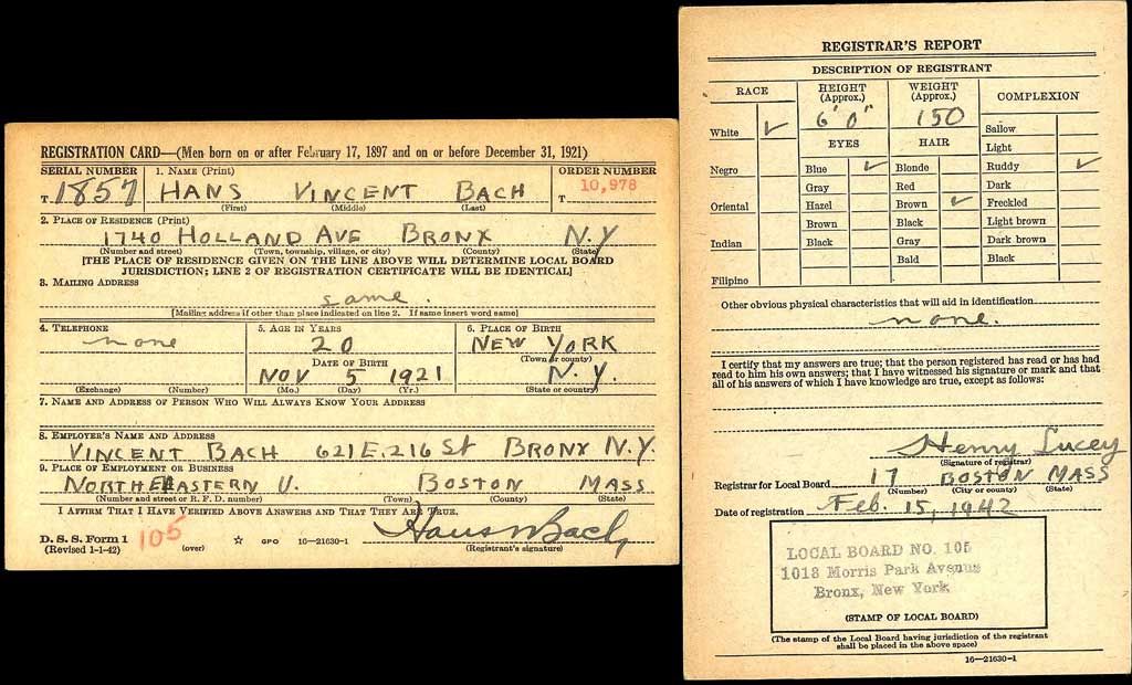 ” Following in his big brother Vincent’s footsteps, Hans Julius Bach, immigrated to the United States in 1919. Hans Julius had three children. The oldest, Hans Vincent Bach, was named for both his father and uncle. He attended Northeastern University as a coop student in Mechanical Engineering. In 1942, he worked at his Uncle Vincent’s factory in the Bronx as part of Northeastern’s work/study program.