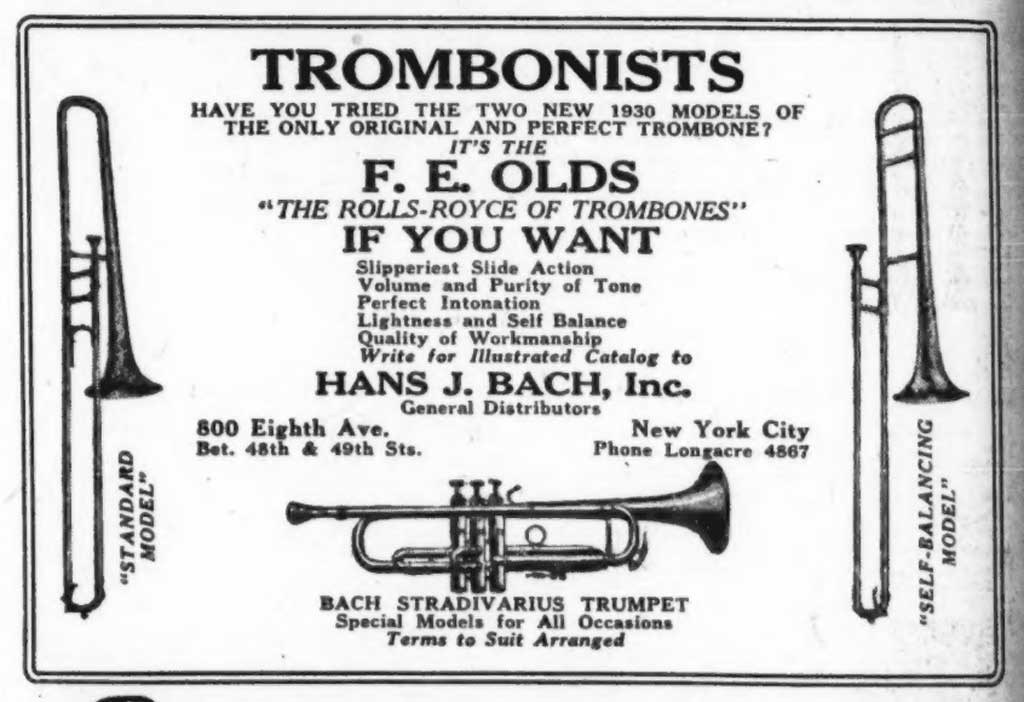 Early in Vincent and Hans Bach’s musical instrument journey, Hans Bach was a distributor of F.E. Olds Trombones. Note in this advertisement, he listed the Vincent Bach Corp. factory on 237 East 41st Street.