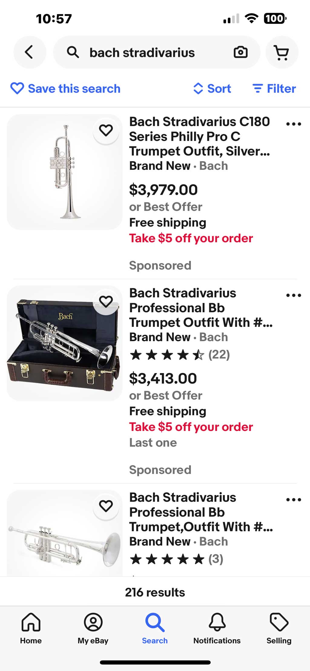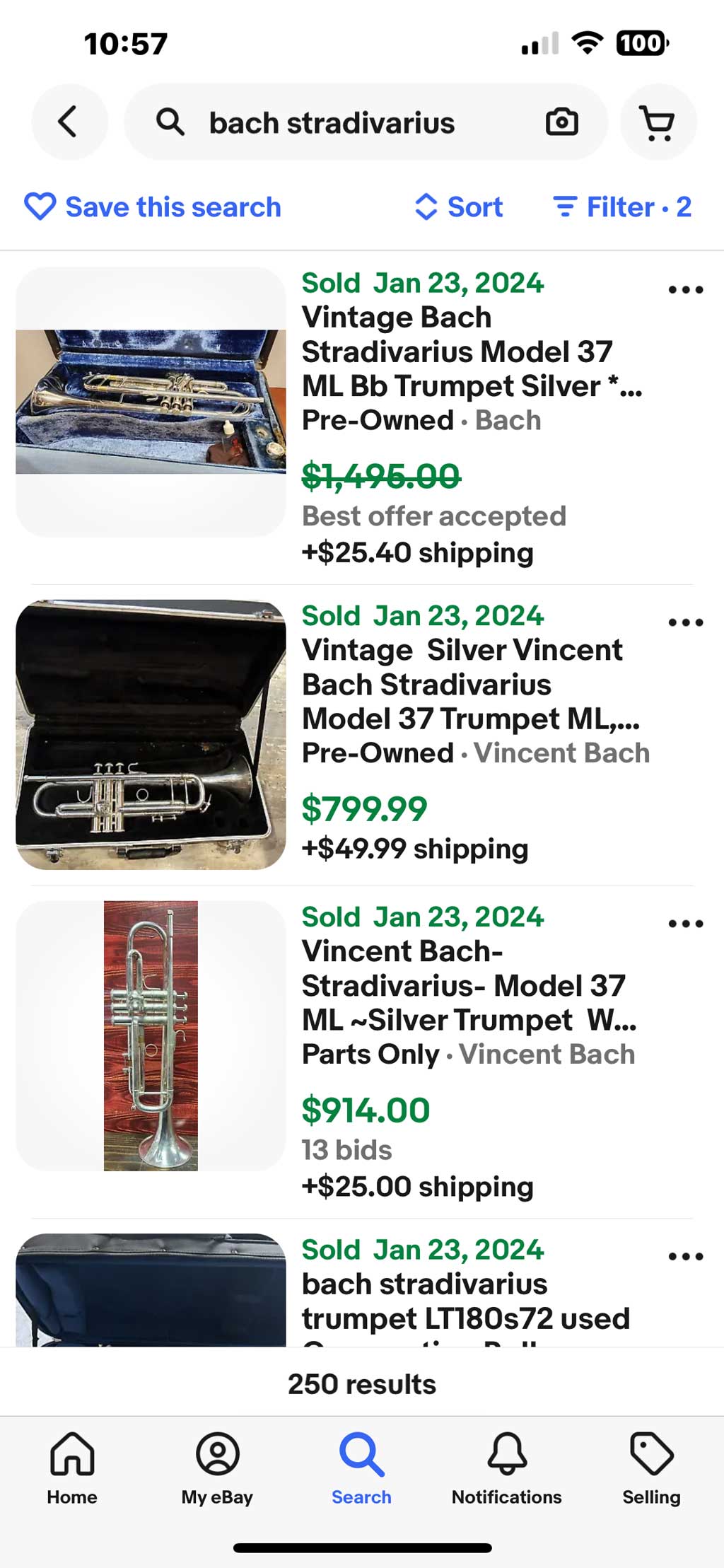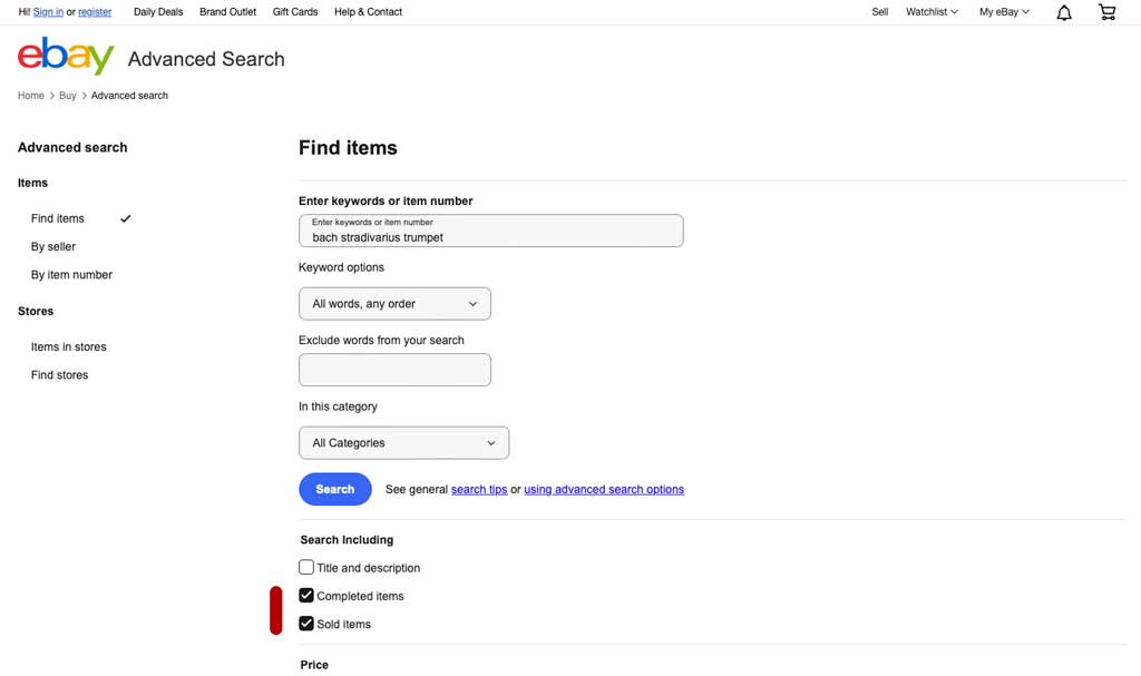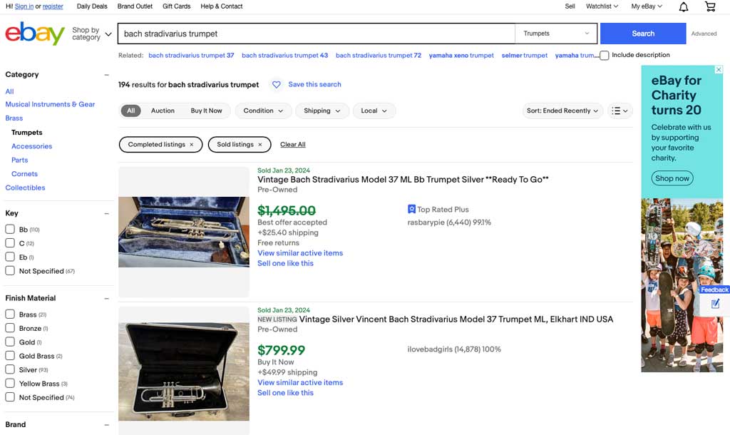A great resource is using eBay’s Advanced Search capability across their various global marketplaces. Do NOT consider the asking price of a listing as the value; instead, use the Advanced Search feature to show recent SOLD listings. This is a good reference for what similar Bach instruments have been sold for.