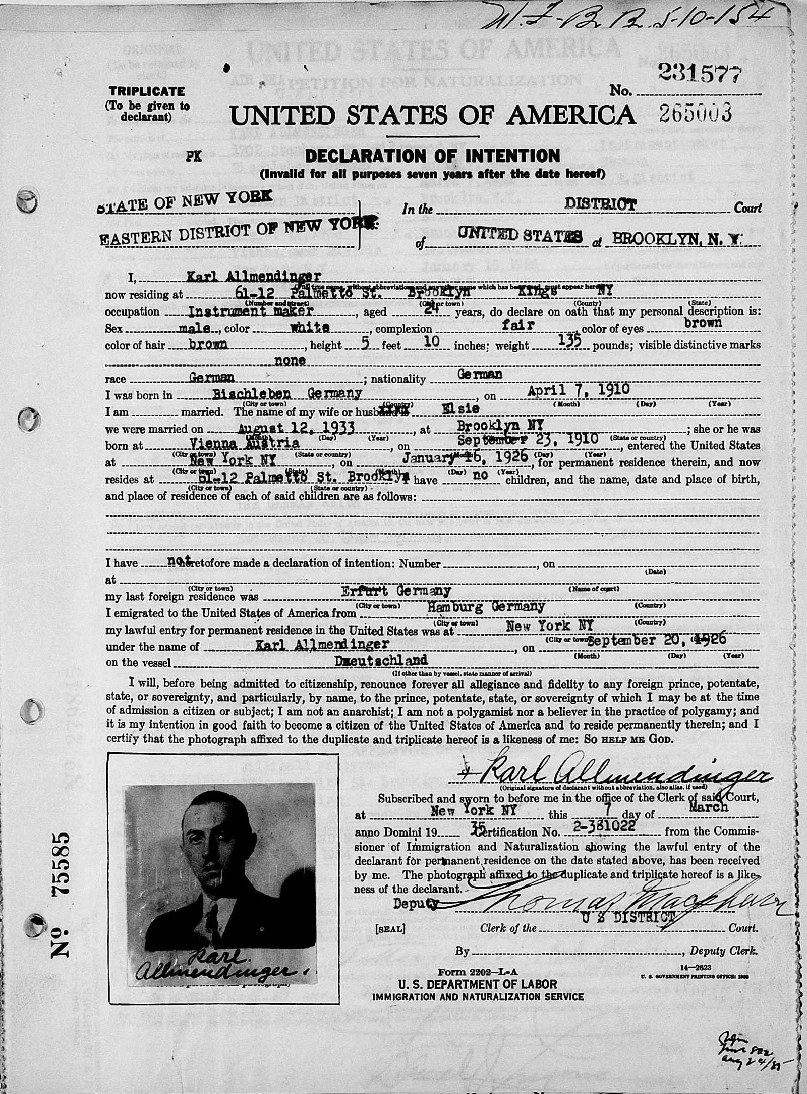 US Immigration Record (1935)