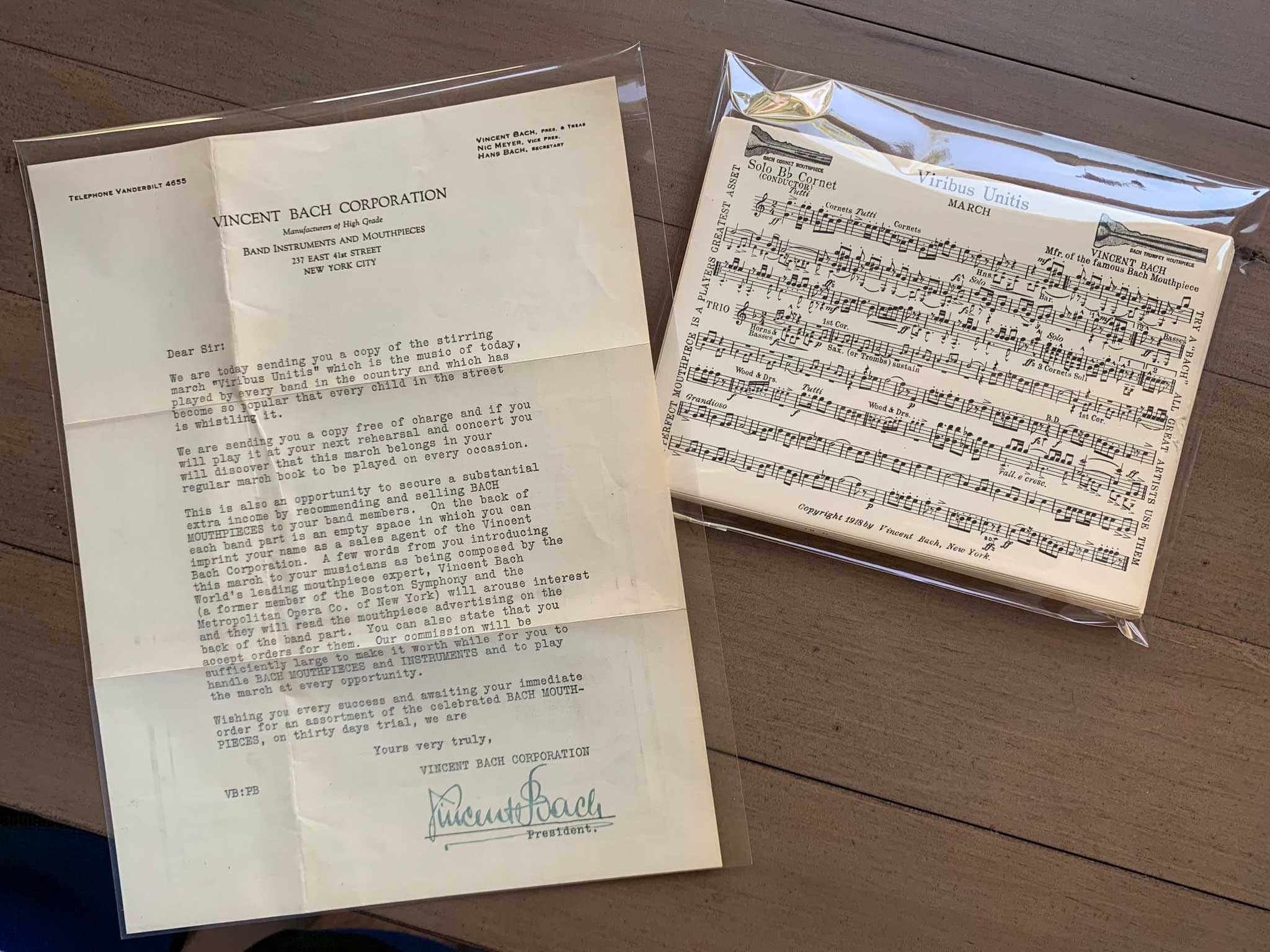 Letter from 1925-1928. Vincent incorporated Vincent Bach Corporation in NYC in 1922, so this letter most likely reflected the corporate officers of the company.
