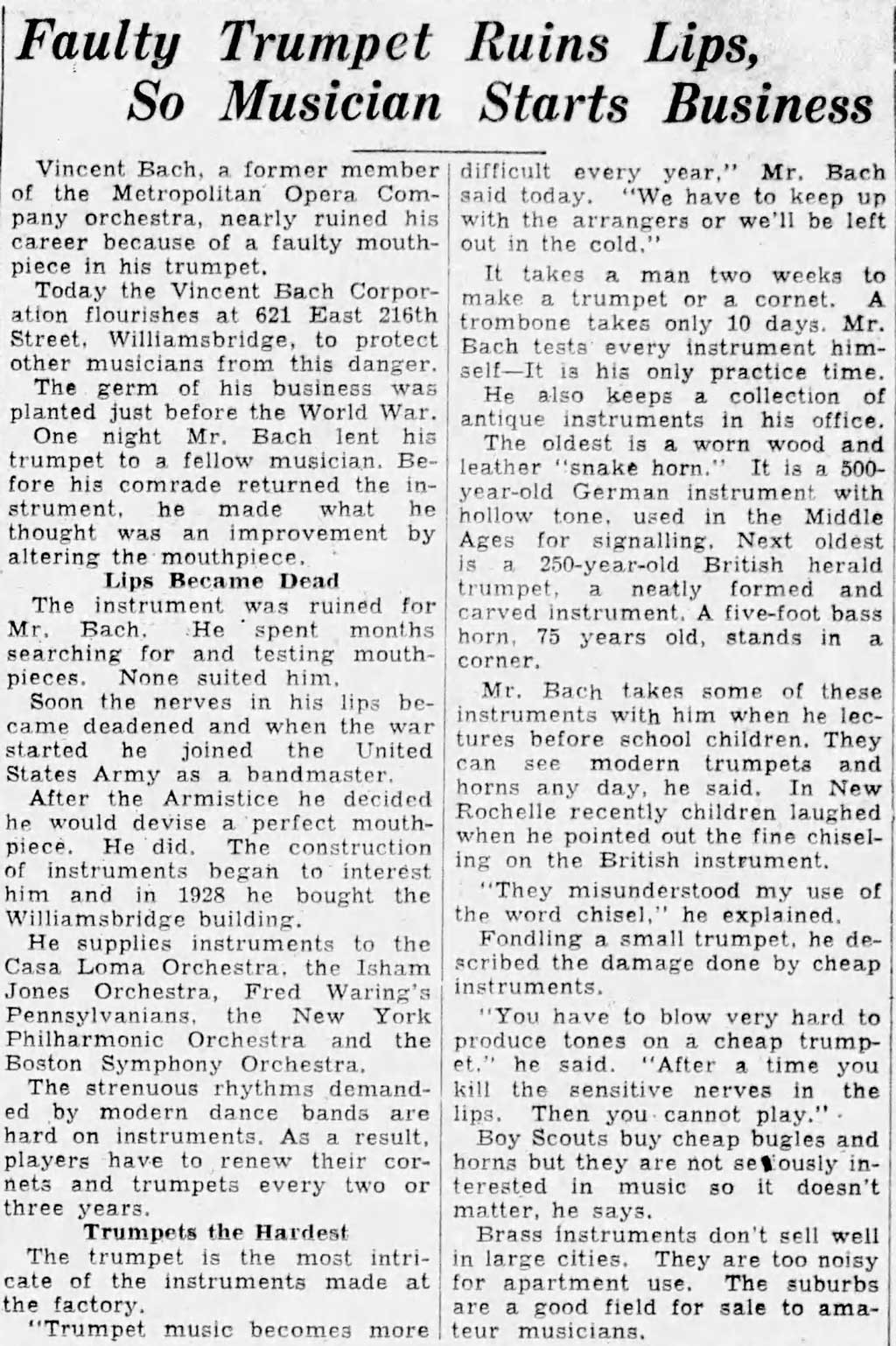Today the Vincent Bach Corporation flourishs at 621 East 216th Street, Williamsbridge, to protect other musicians from this danger. The germ of his business was planted just before the World War. One night Mr. Bach lent his trumpet to a fellow musician. Before his comrade returned the instrument, he made what he thought was an improvemnt by altering the mouthpiece.