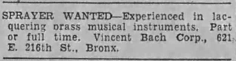 It is interesting to see the various job postings Vincent Bach Corp. posted in local newspapers.
