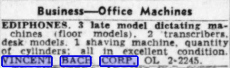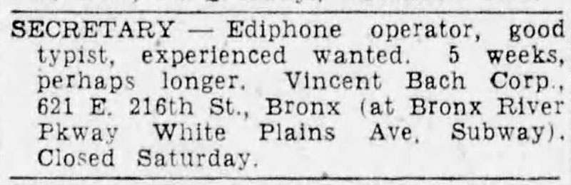 - “General office worker. Experience and speed essential. Call MO 4-0900 or write to Vincent Bach Corp.”
