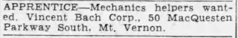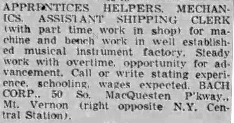 - “Excellent opportunity to learn brass musical instrument trade. Steady work.” “After June 1st, MacQuesten Parkway, Mount Vernon, N.Y.”