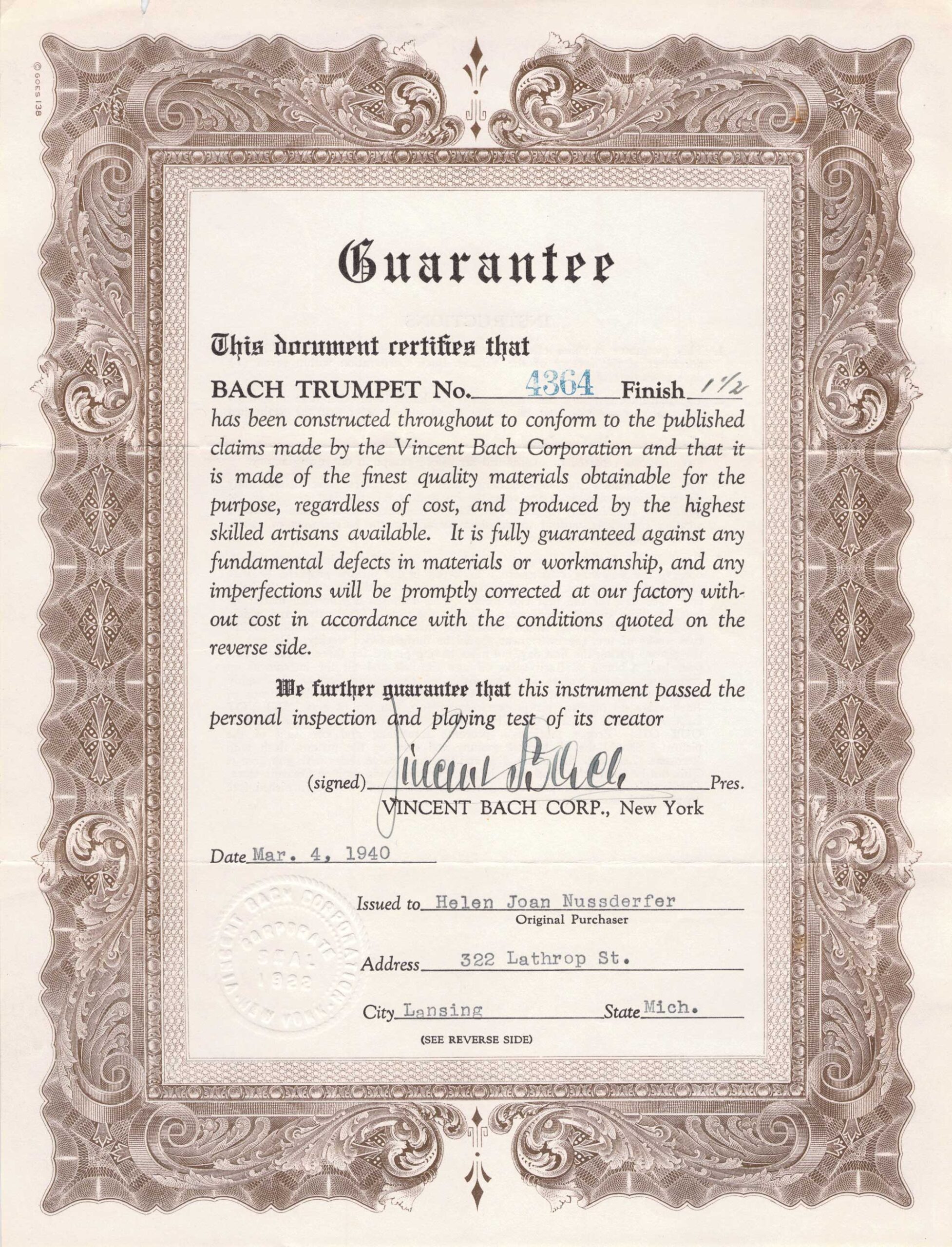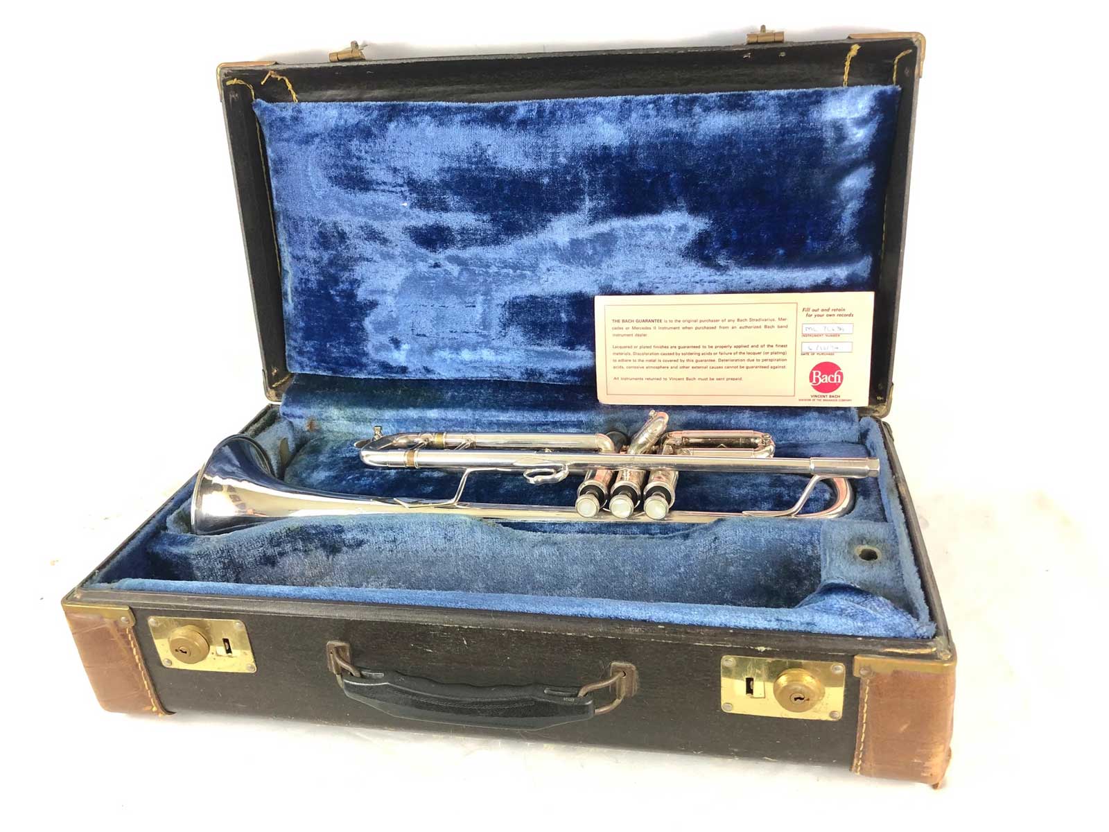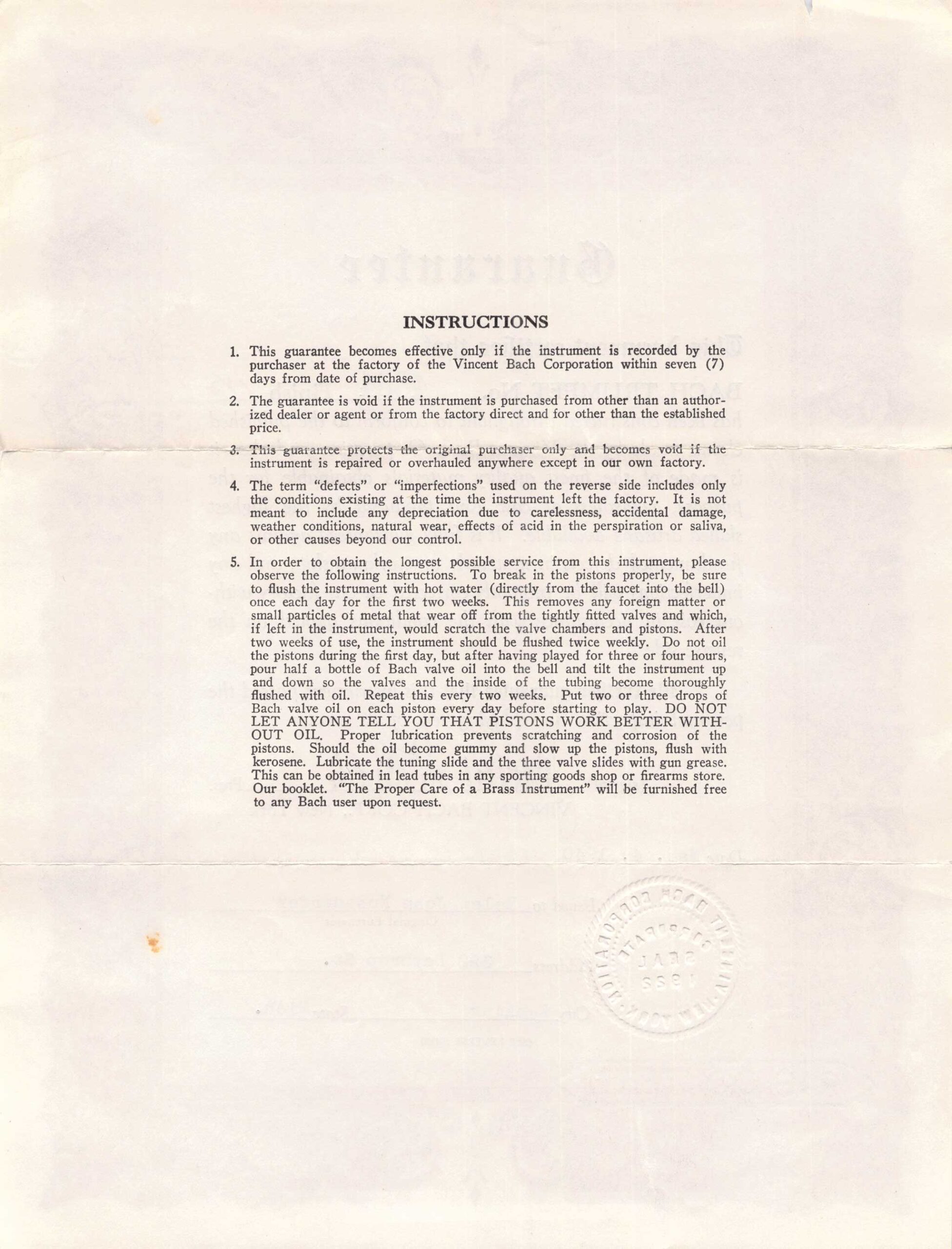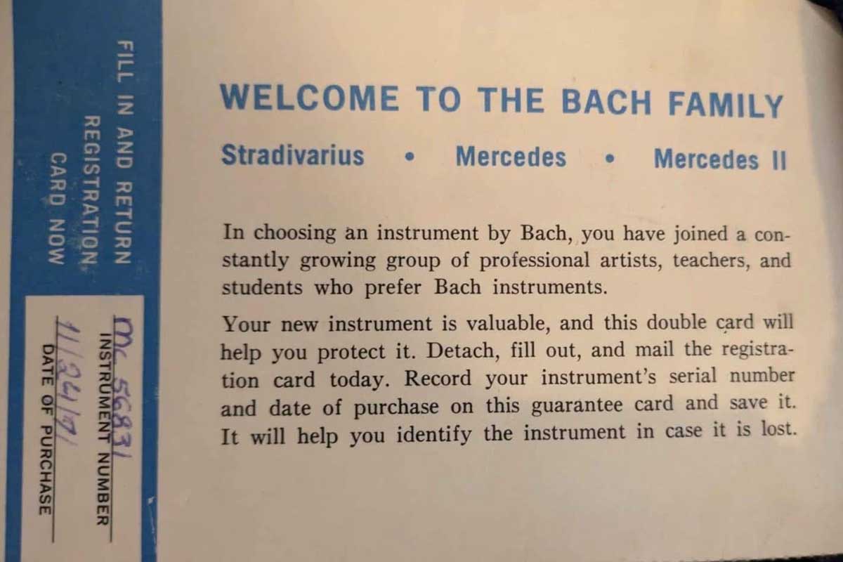 The registration and warranty cards for Vincent Bach’s trumpets have changed. Starting in the 1930s, Vincent Bach used to sign a warranty certificate for each Vincent Bach Stradivarius instrument sold. Later, in the Mt. Vernon era, they switched to a standardized registration and warranty card, which the owners returned to Vincent Bach Corporation.