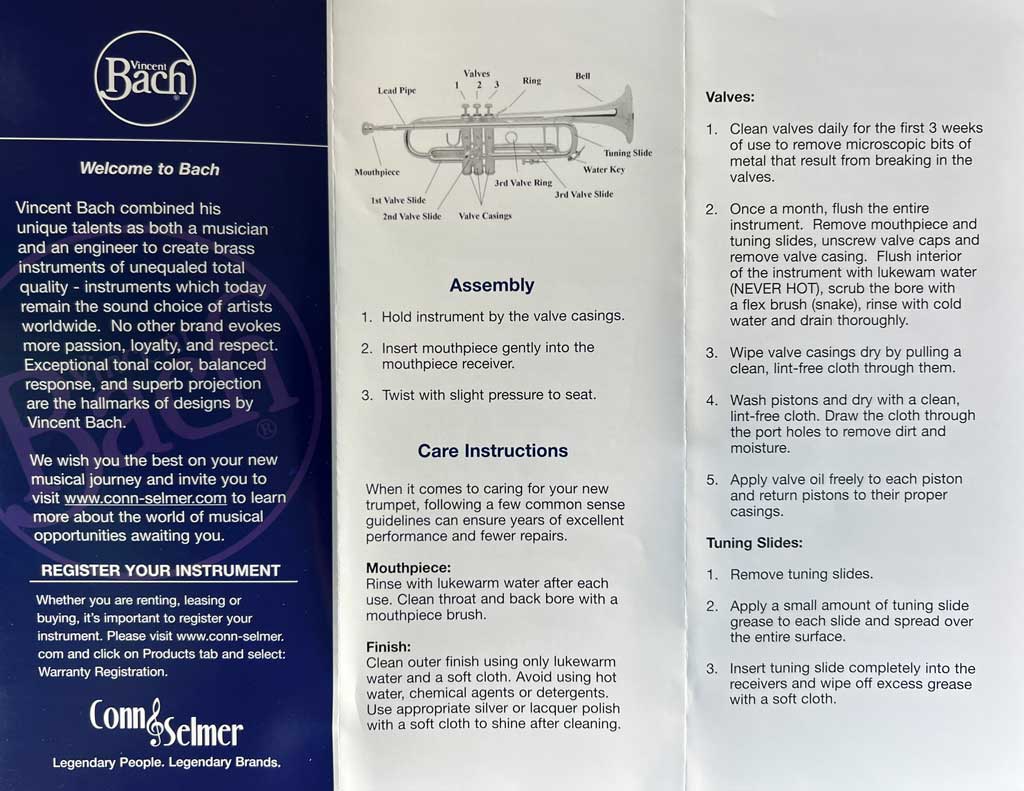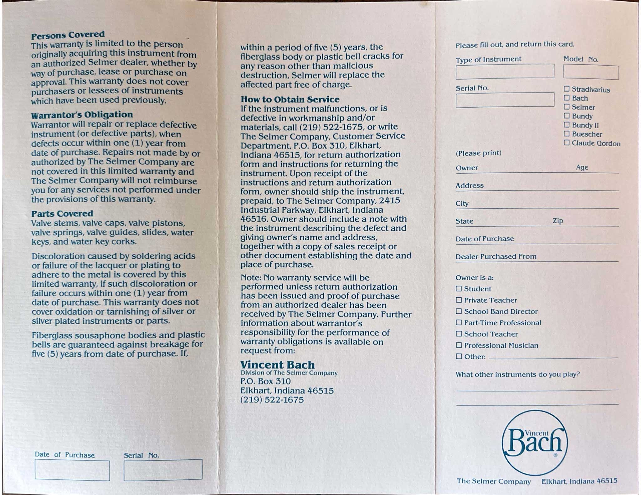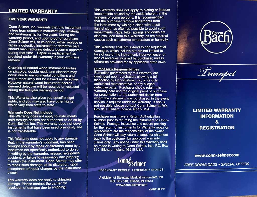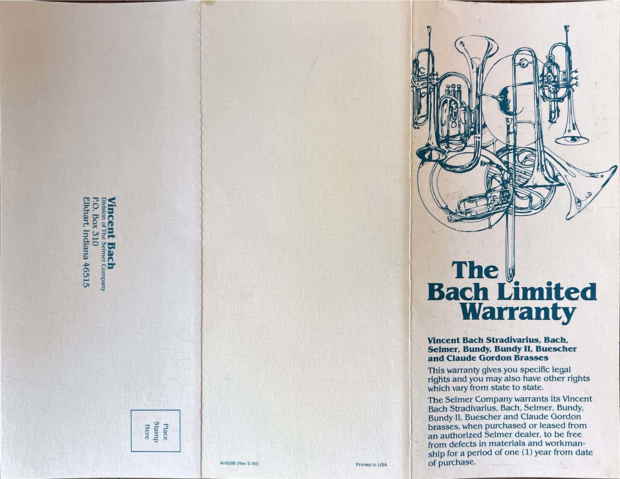 Once the H. & A. Selmer company purchased Vincent Bach Corporation, they transitioned to a standardized Bach warranty information, as demonstrated below. If you have any additional examples, please share them with us through the footer.