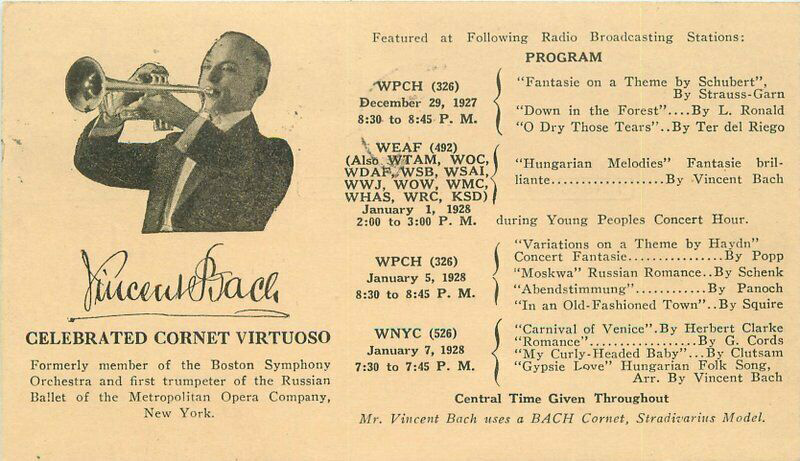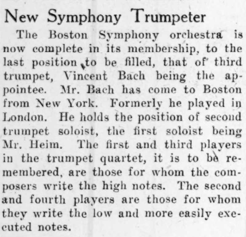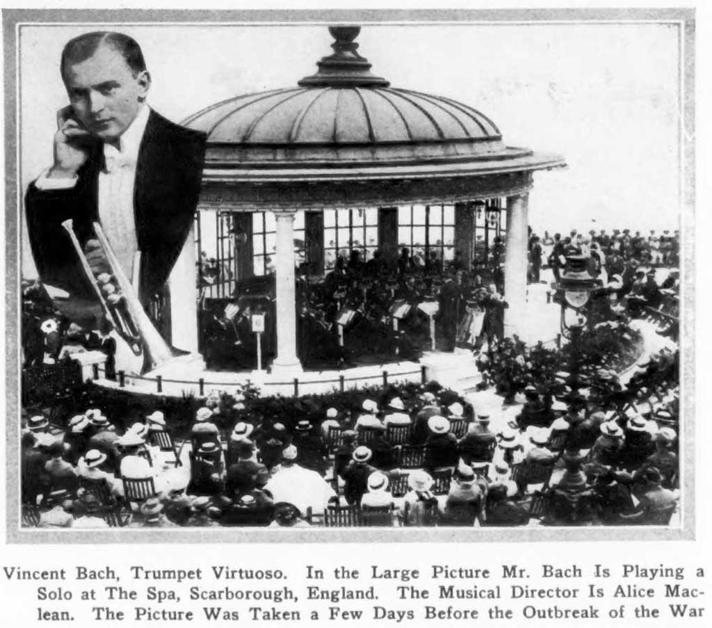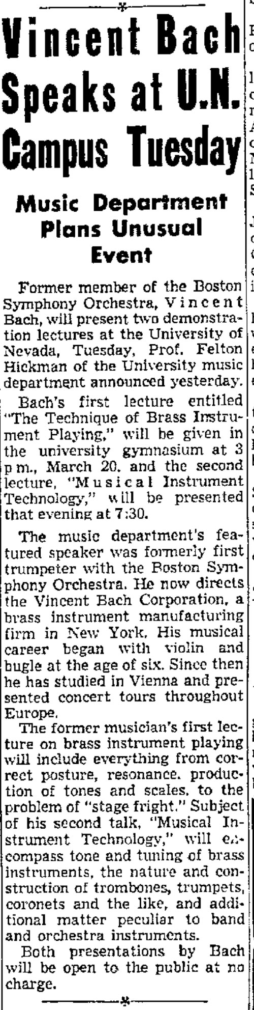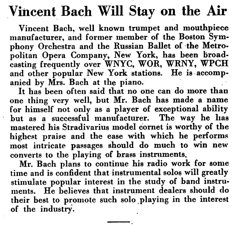 ” One of the biggest features of the above program was the playing of several trumpet solos by Vincent Bach of New York City. Mr. Bach is a nationally known soloist who has played many times throughout this country and Europe. The trumpet, cornet, alto, baritone, and trombone mouthpieces that bear his name and his instruments rank with the best.”