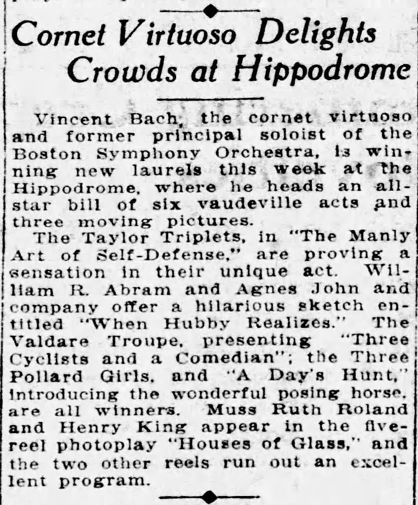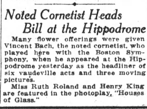 ” The George Birkle Co is advertising a number of recitals by Vincent Bach, the noted trumpeter, at its store (in Los Angeles). Herr Bach became an officer in the Austrian Navy and was later taken prisoner by the British. Escaping from an English prison last autumn, he made his way to this country and finally to this city. His recitals are given at Birkle’s three afternoons each week.”