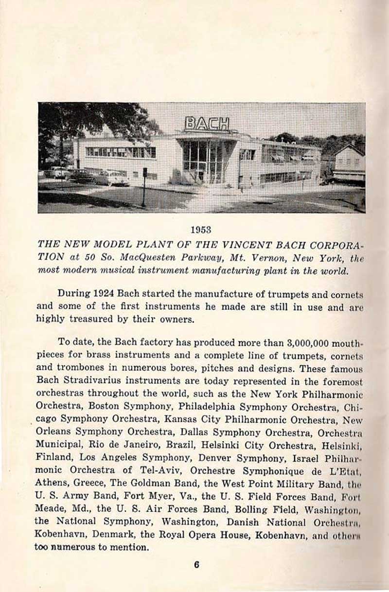 “As a brilliant musician, a graduate mechanical engineer, and a practical manufacturer, Vincent Bach is eminently qualified to speak on all subjects related to brass instruments. What proved to be his life work really began at the early age of six years, where he was introduced the violin and bugle. His aptitude was for the bugle and having developed an excellent embouchure, his thoughts turned to the trumpet. At fourteen Vincent Bach began taking lessons from Georg Stellwagen, principle trumpet player with the Vienna Tonkunstler Orchestra. Mr. Stellwagen was considered one of the greatest trumpet virtuosos in Europe. later Bach took lessons from the First Trumpeter of the Vienna Opera House, at the same time pursuing his studies to become a mechanical engineer, that being his chosen profession.