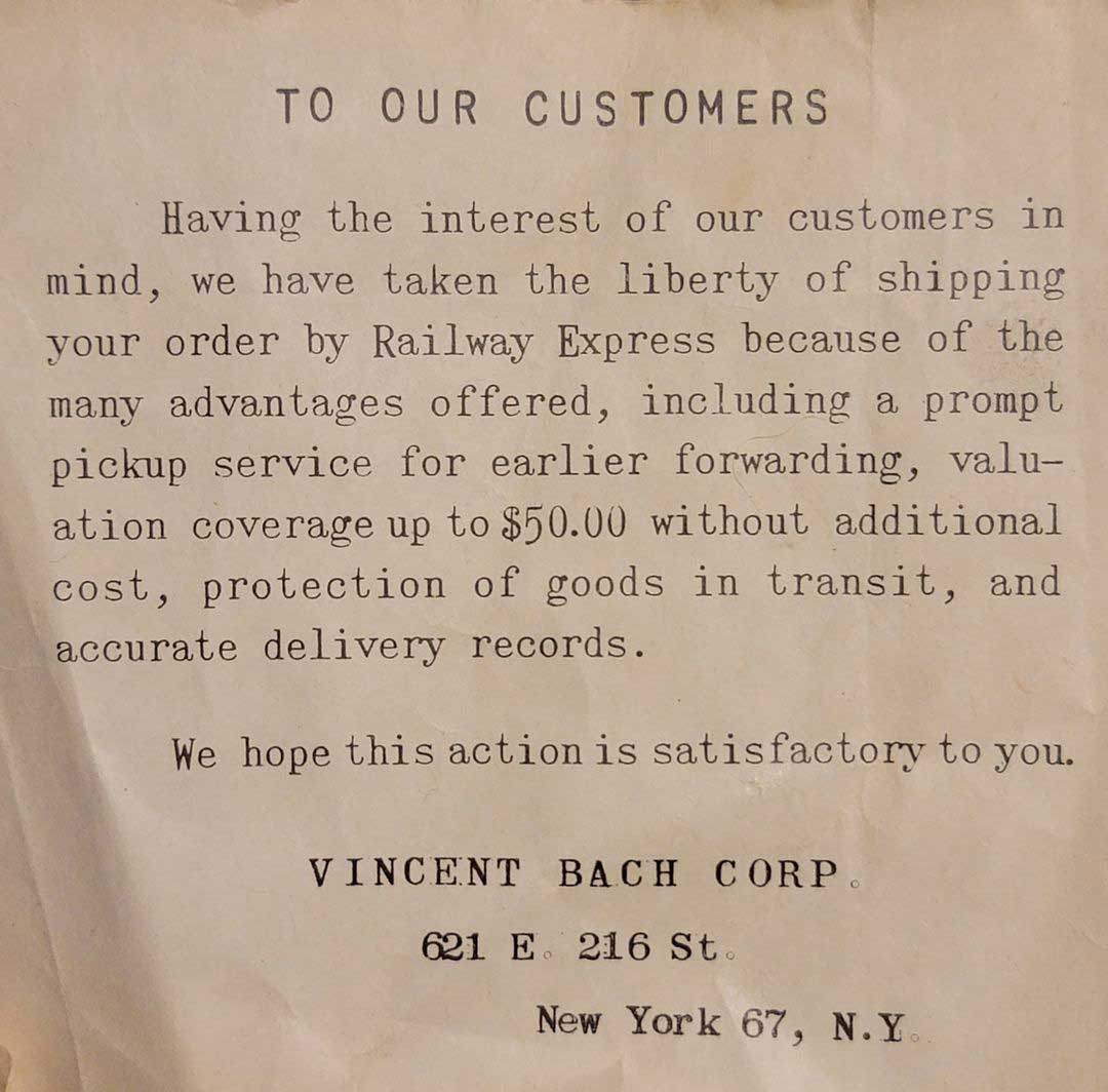 Vincent Bach Corp. Railway Express Shipping Service - Bronx era